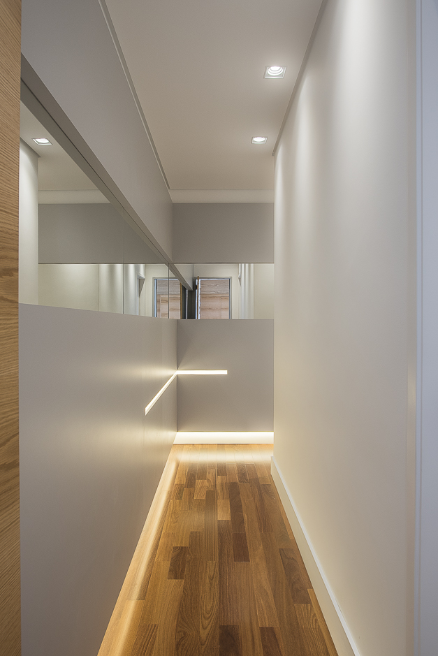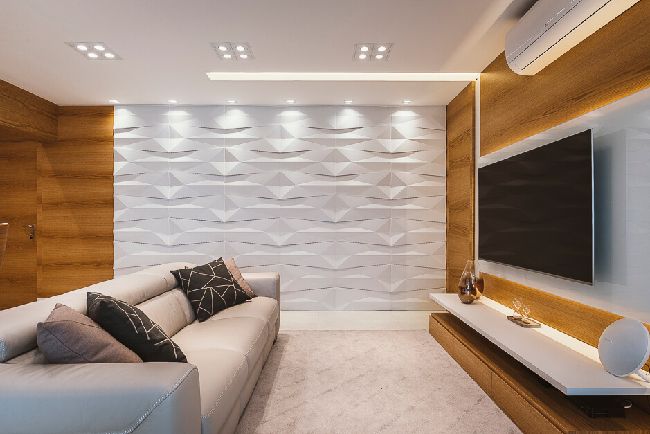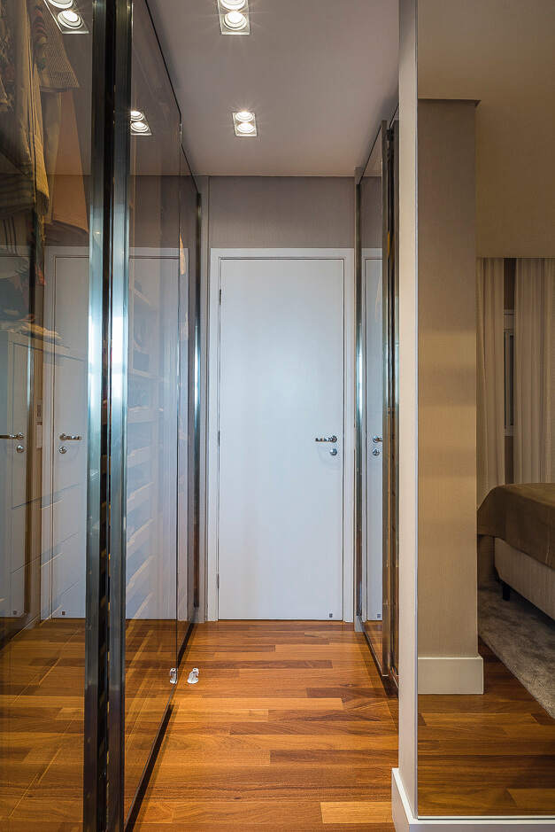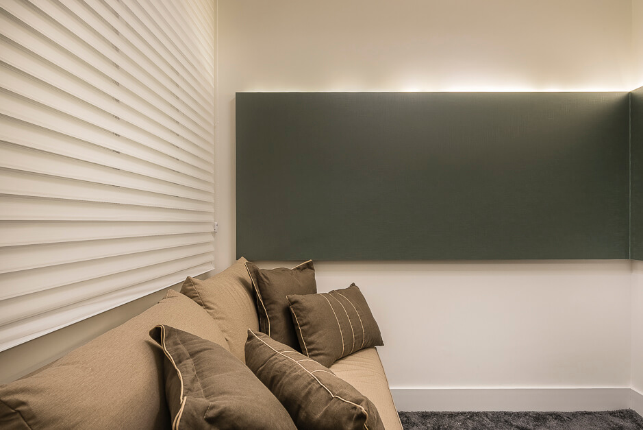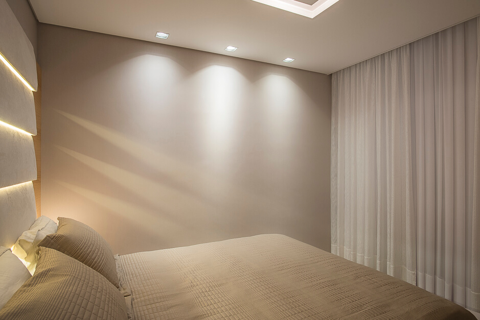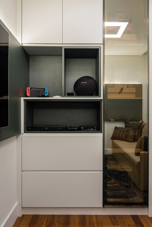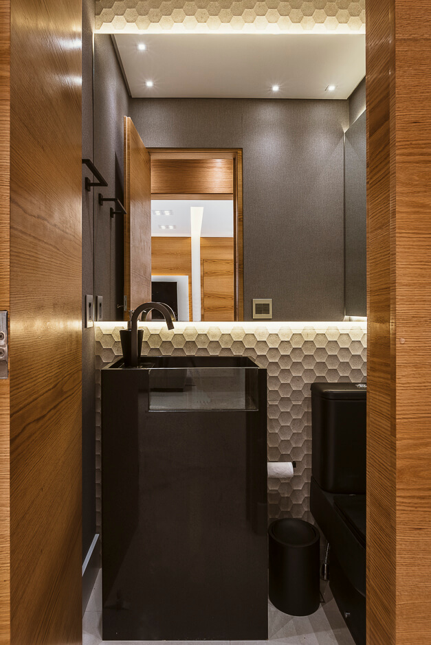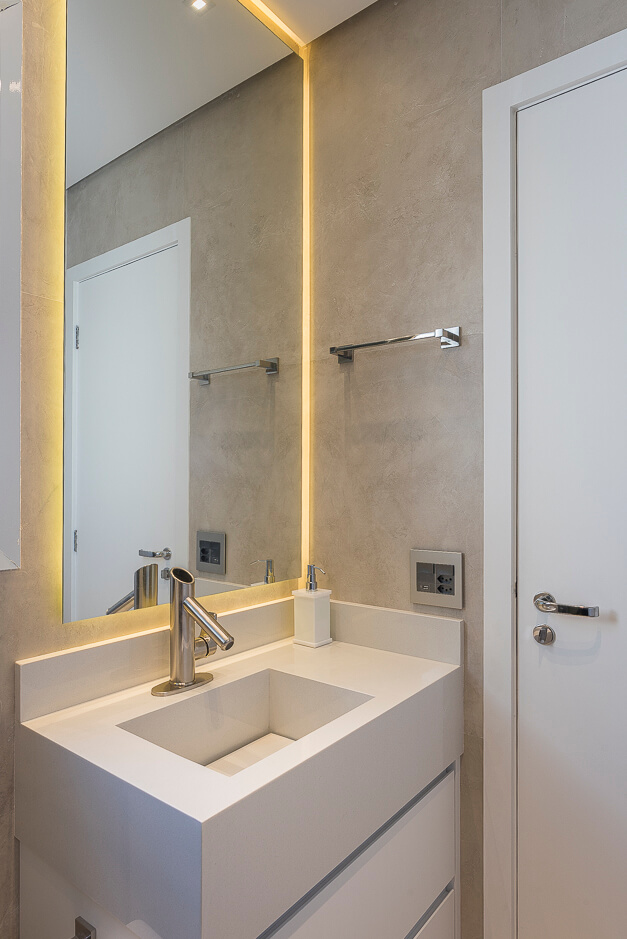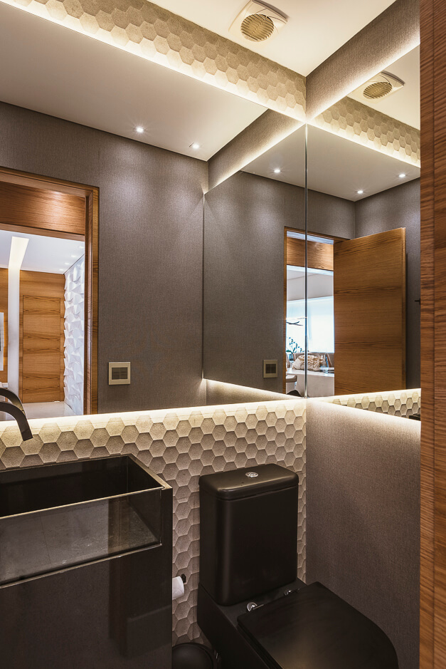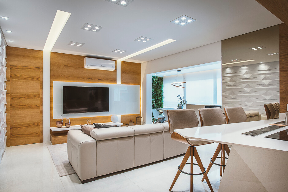 Toda a marcenaria foi projetada de forma elegante com iluminação em diversos pontos.