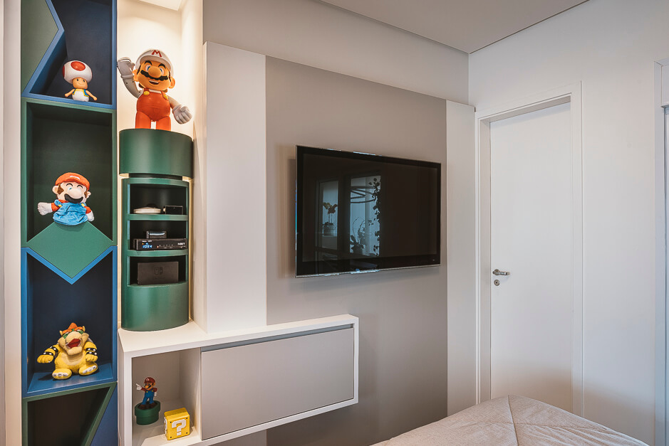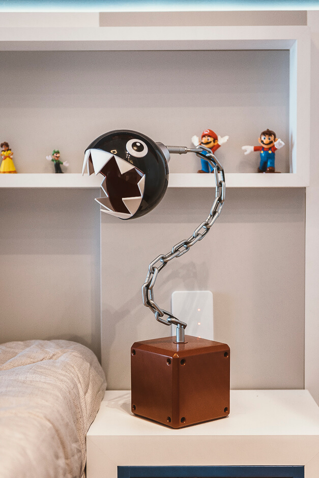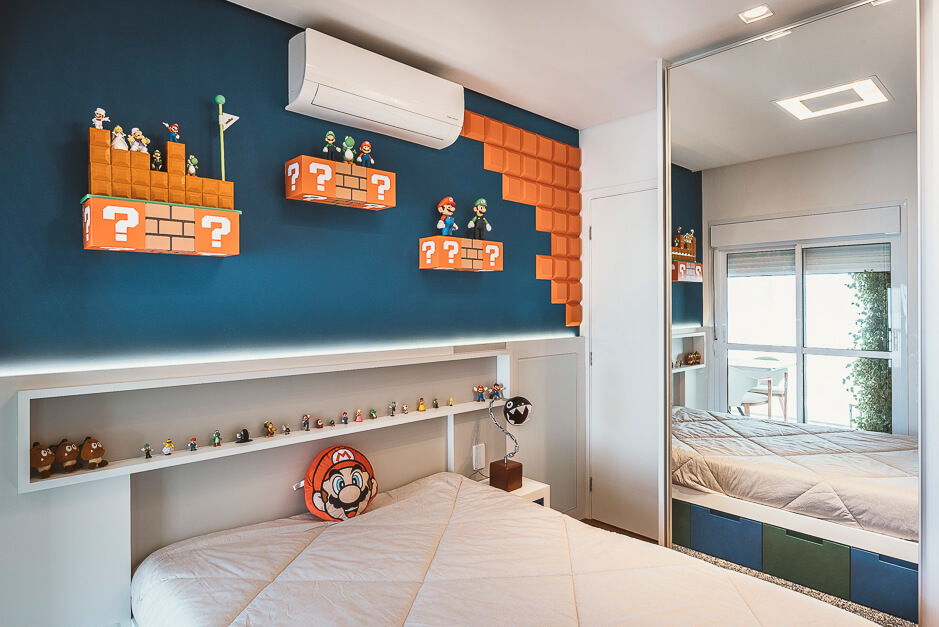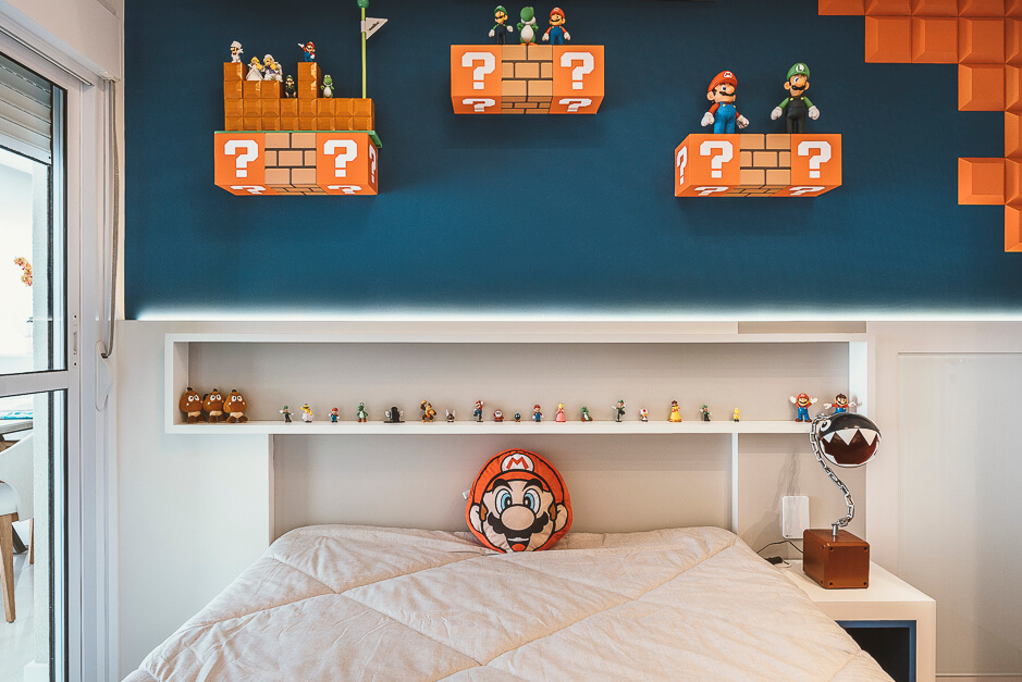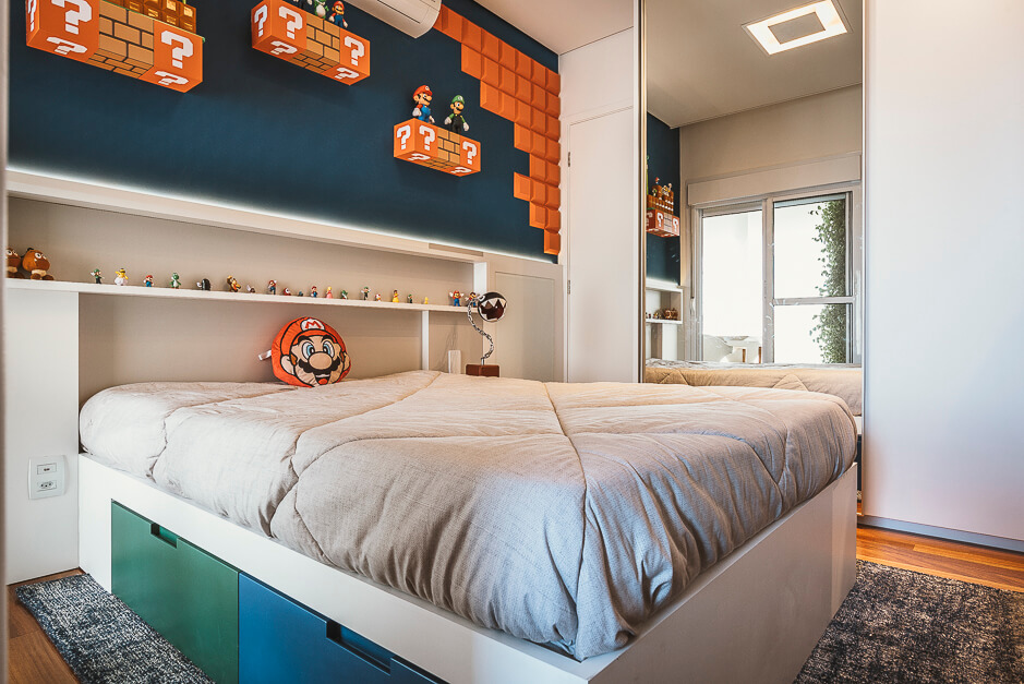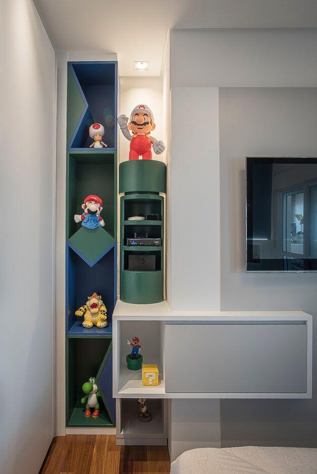 O espaço mais alegre da casa é o quarto da criança, projetado de forma lúdica onde encontramos o Super Mário e suas referências desde os tons de pintura até o tubo de descida do jogo.