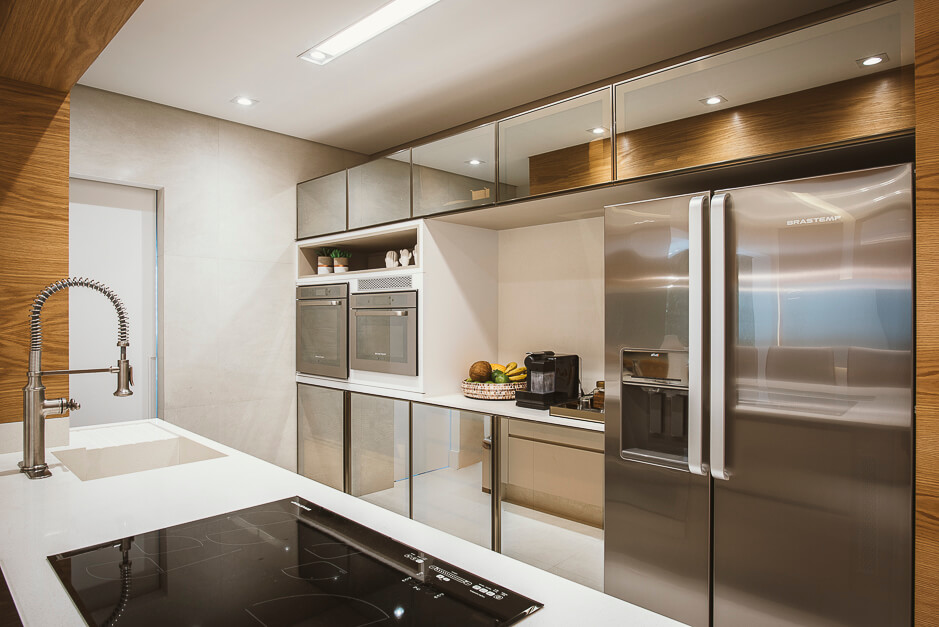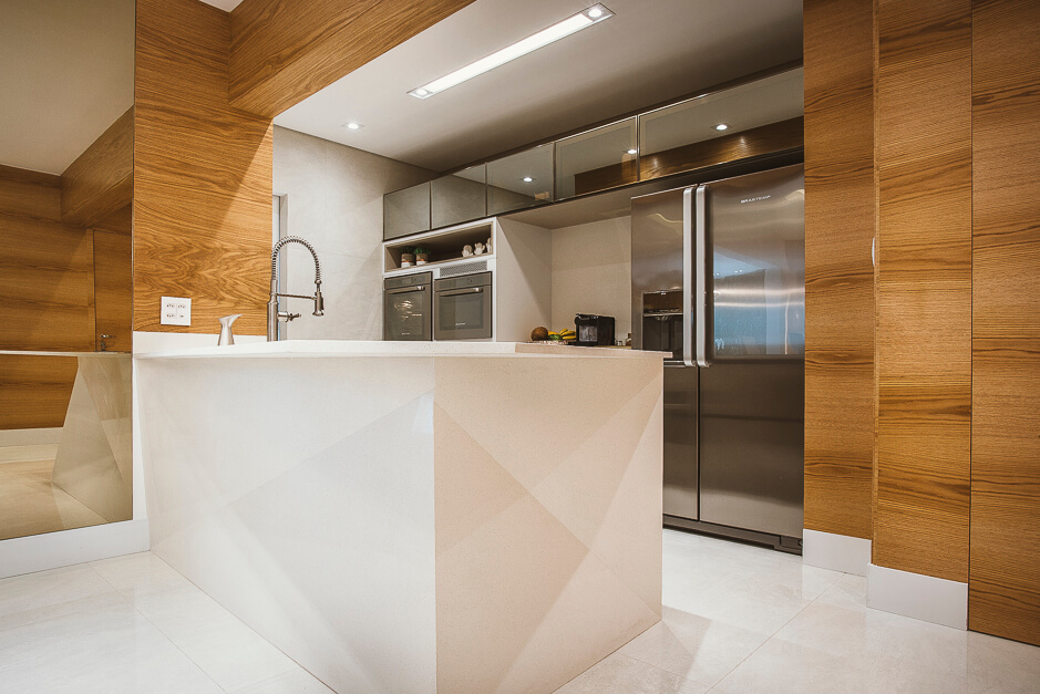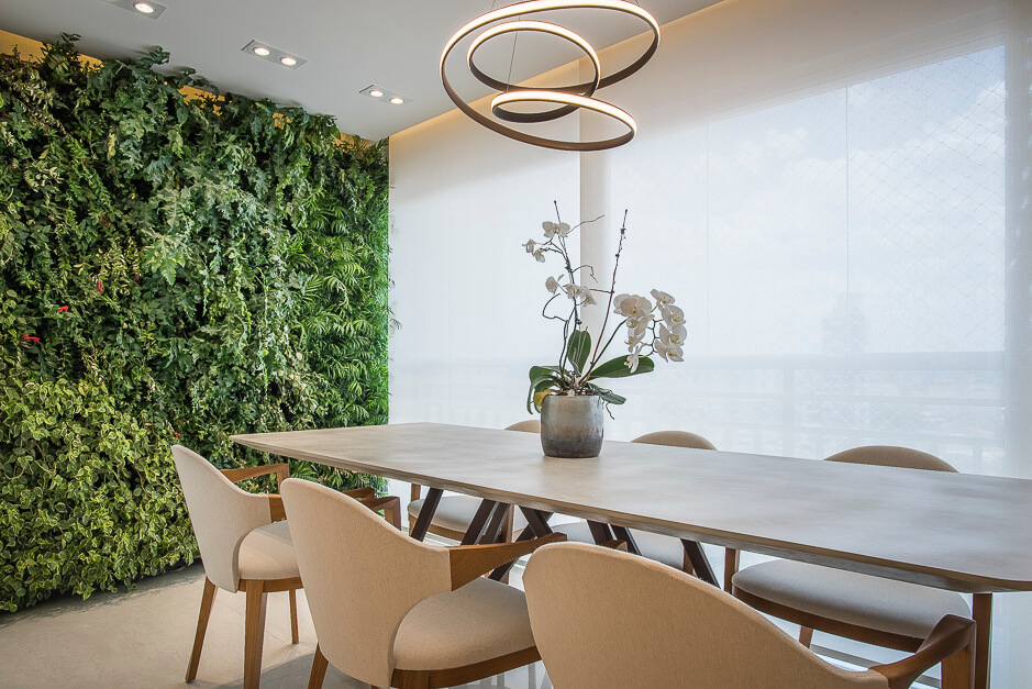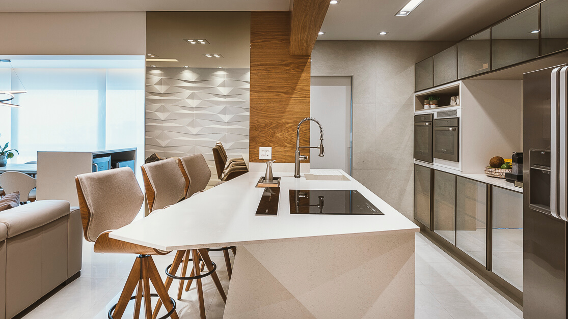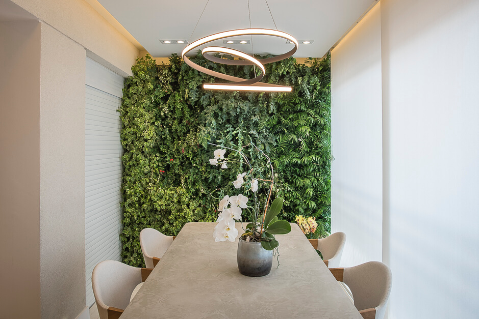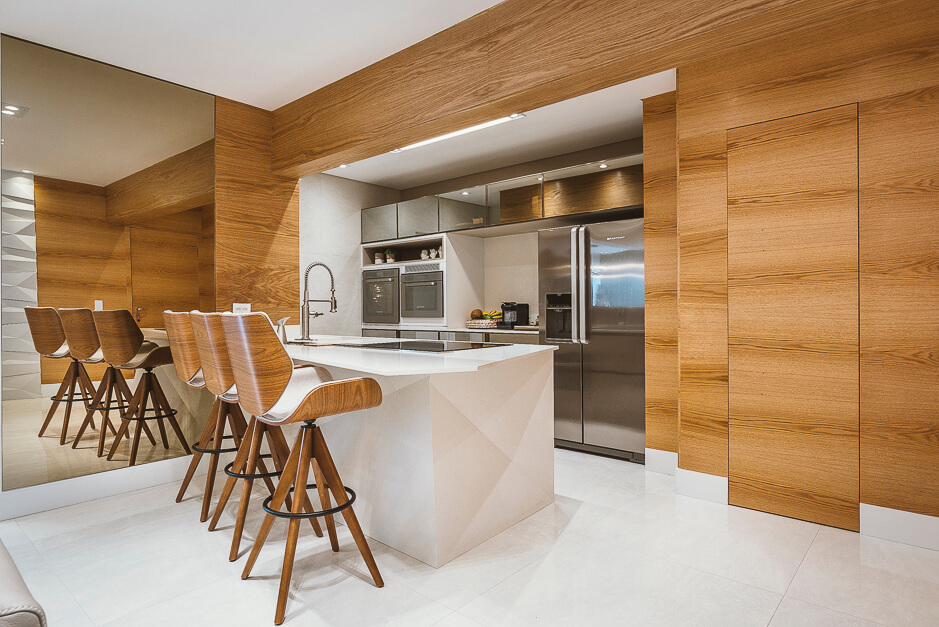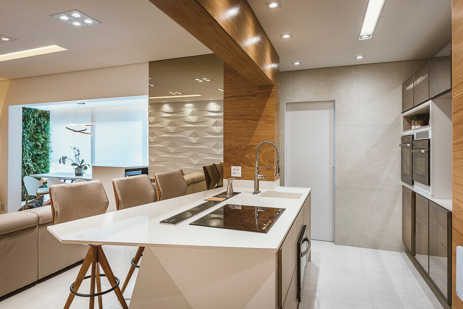 A bancada em pedra da cozinha tem um desenho todo especial que se projeta transformando em uma bancada. O terraço gourmet recebeu um conjunto de mobiliário assinado por Daniela Ferro e Lattoog. A parede verde natural com irrigação automática garante vida ao ambiente.