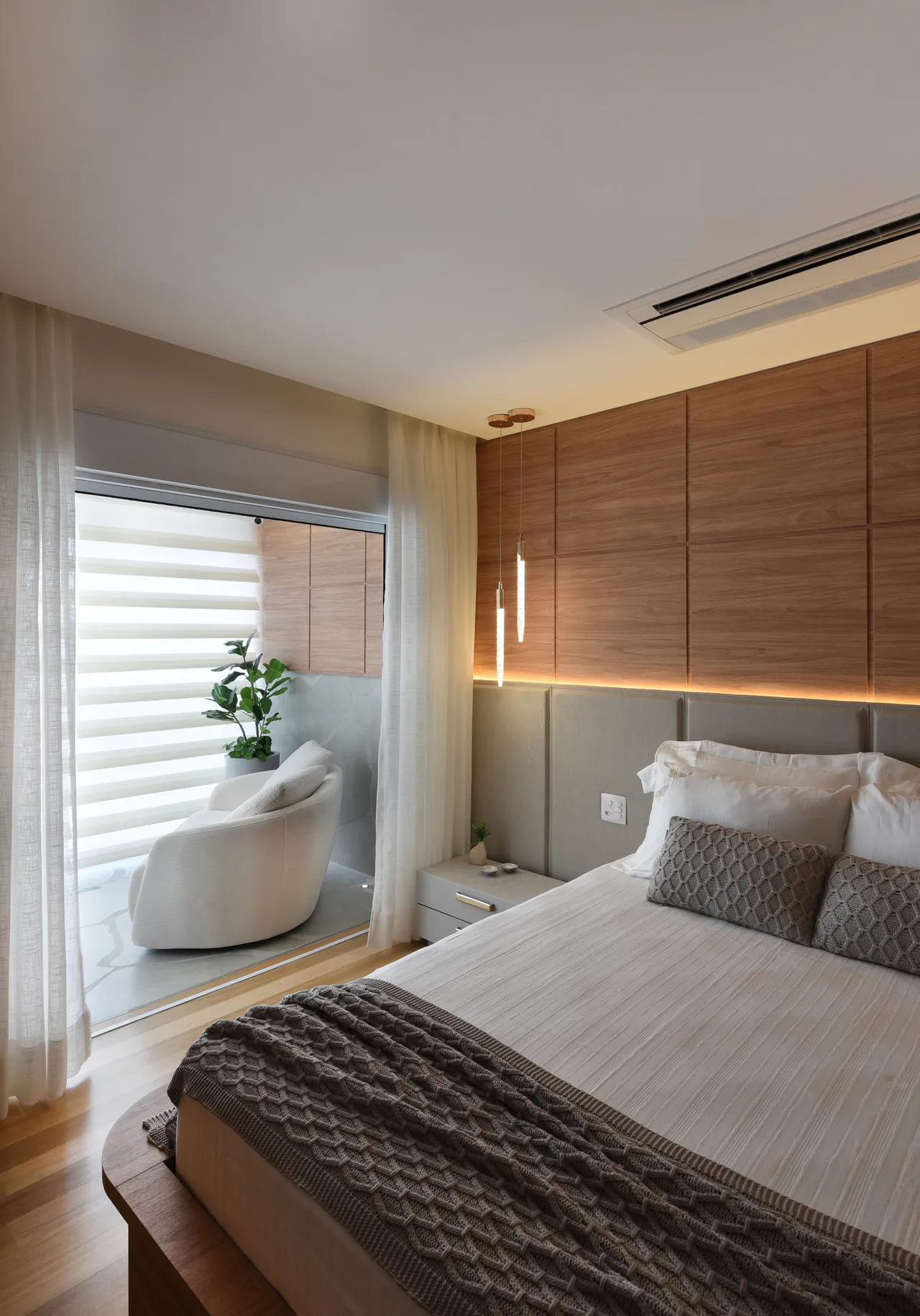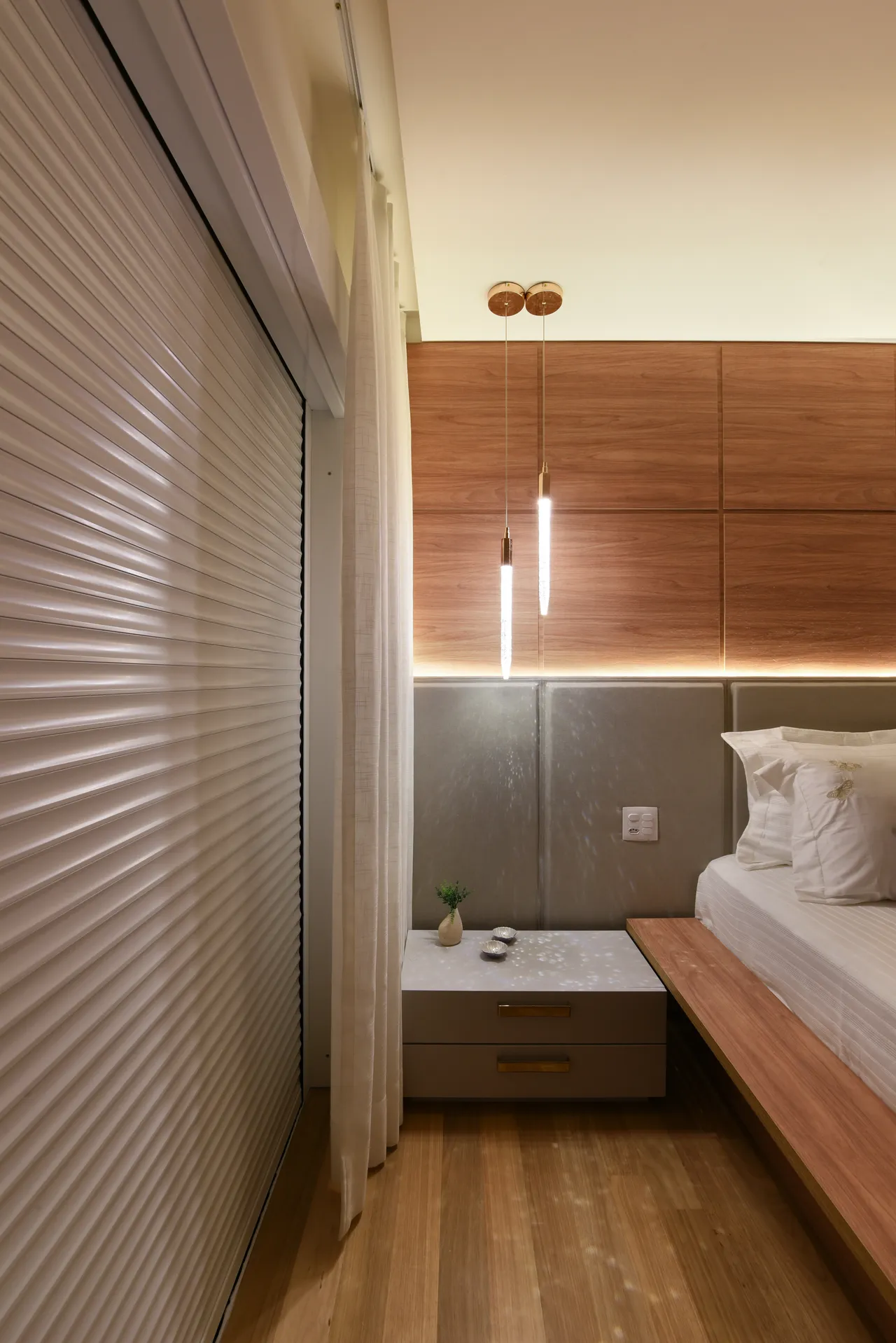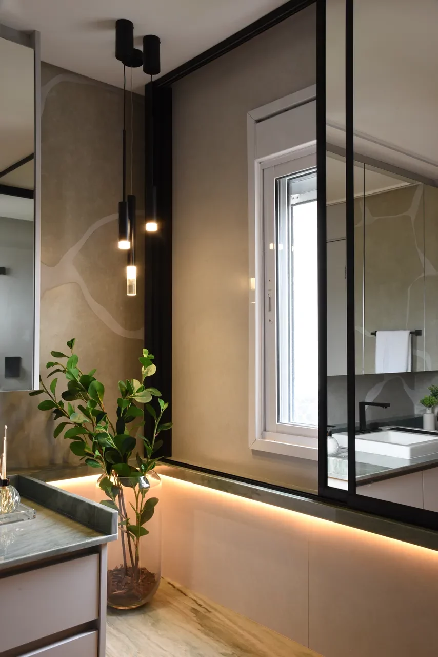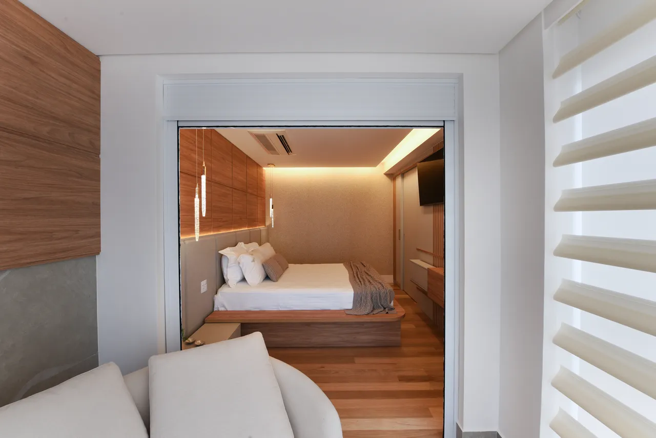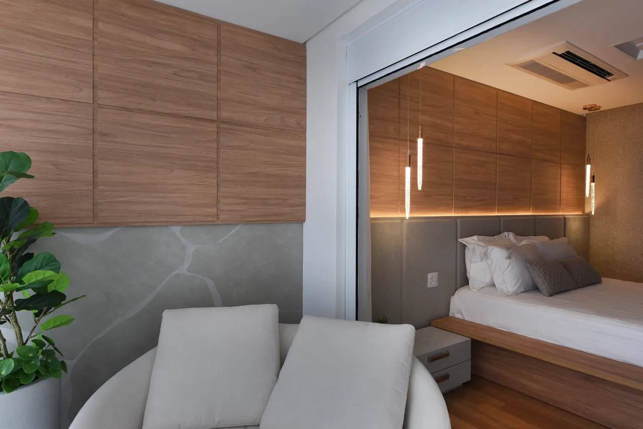 Já na área íntima, a atenção à escolha dos tons neutros e a harmonia com a madeira resultam em ambientes aconchegantes. A ligação direta da suíte com a varanda proporciona uma sensação de amplitude e uma conexão o exterior. No banheiro da suíte, o uso do quartzito verde, assim como na área social, mais uma vez unifica os espaços.