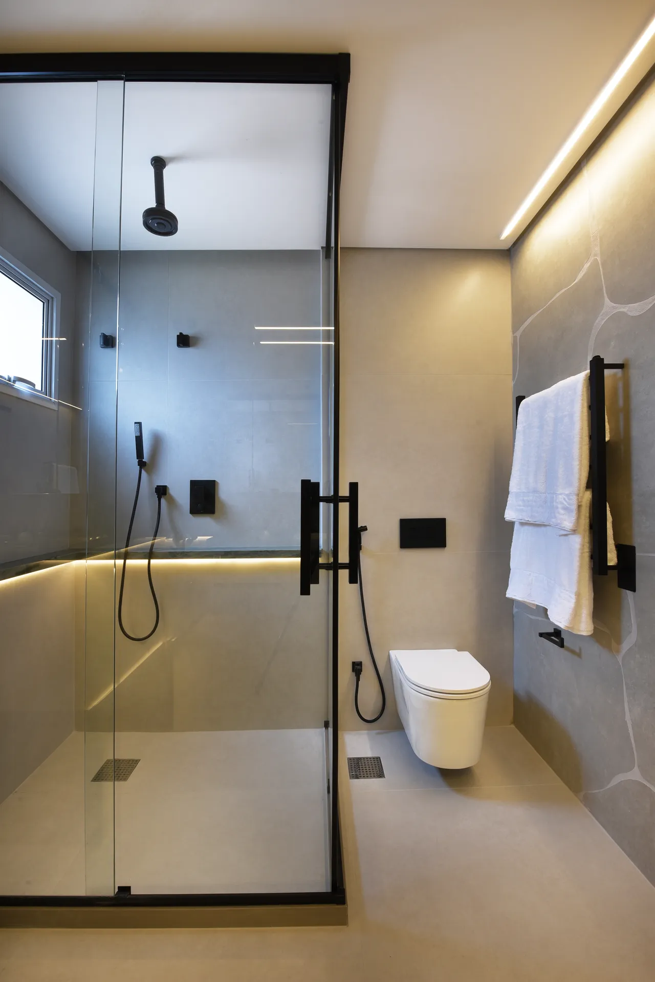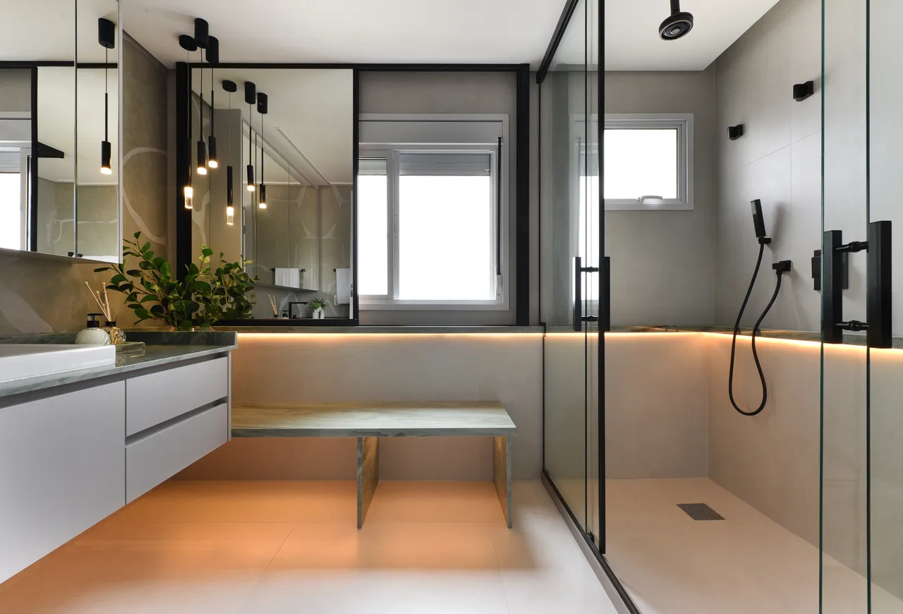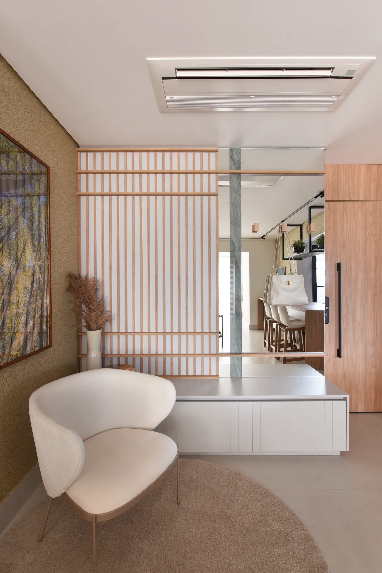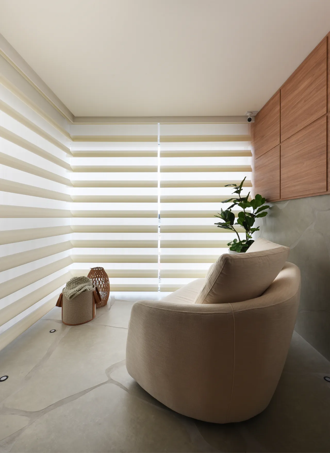 Já na área íntima, a atenção à escolha dos tons neutros e a harmonia com a madeira resultam em ambientes aconchegantes. A ligação direta da suíte com a varanda proporciona uma sensação de amplitude e uma conexão o exterior. No banheiro da suíte, o uso do quartzito verde, assim como na área social, mais uma vez unifica os espaços.