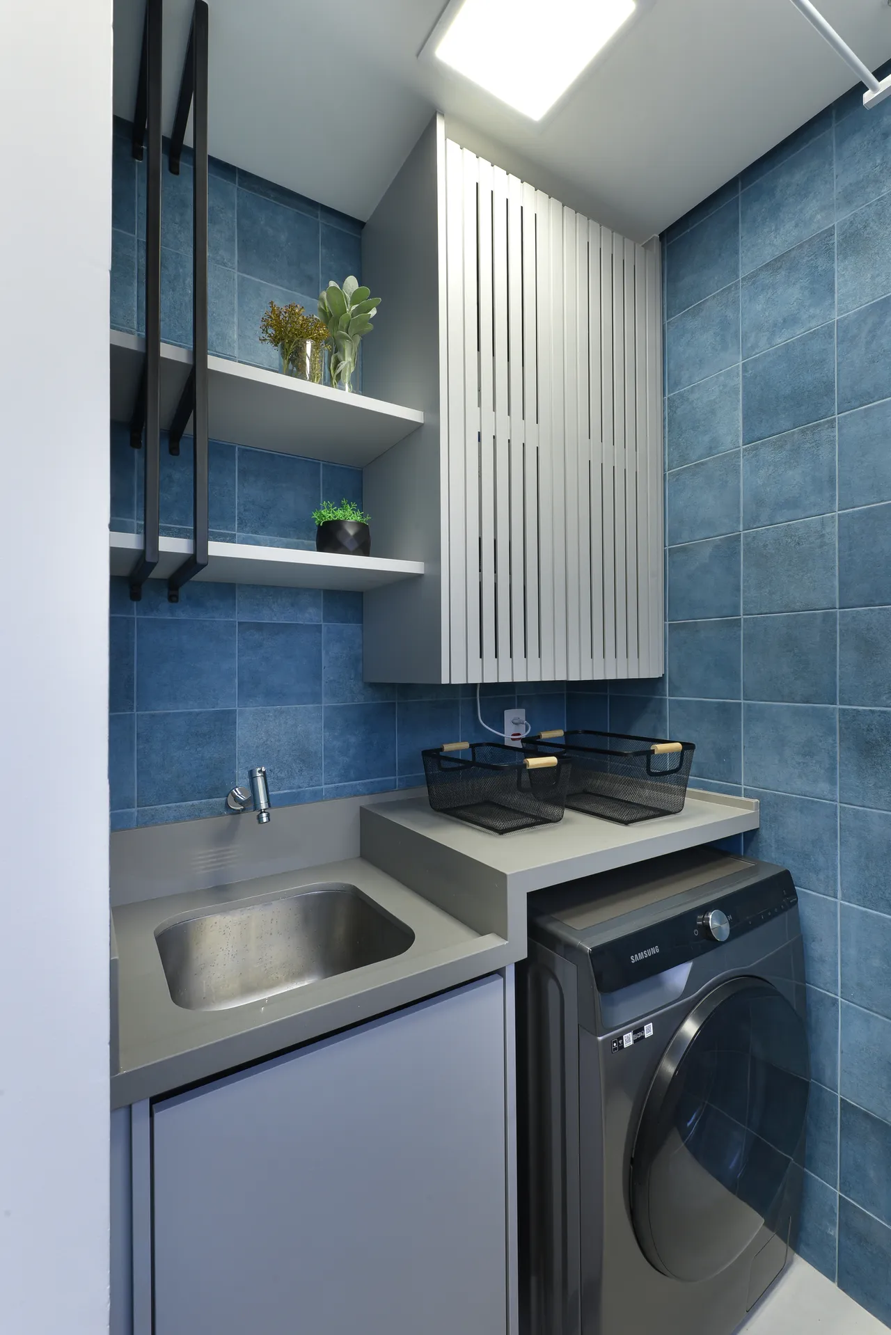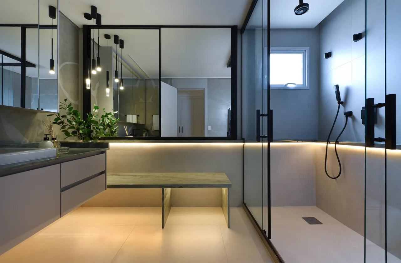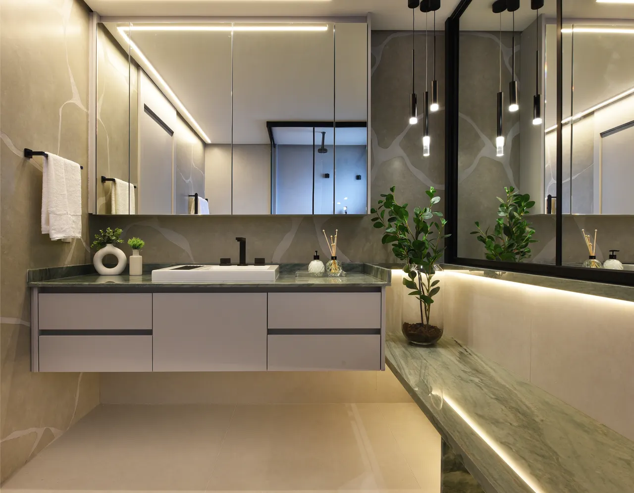 Aqui, optamos por tons suaves de cinza, azul e verde, harmonizados ao calor da madeira, resultando em uma paleta de cores que transmite uma atmosfera tranquila e acolhedora. Os tons suaves de cinza proporcionam elegância e neutralidade, enquanto o verde adiciona frescor, serenidade e sofisticação, especialmente por ser derivado da pedra em quartzo. A combinação destas cores com a madeira cria um ambiente equilibrado, onde a natureza e a sofisticação se integram de maneira harmoniosa.