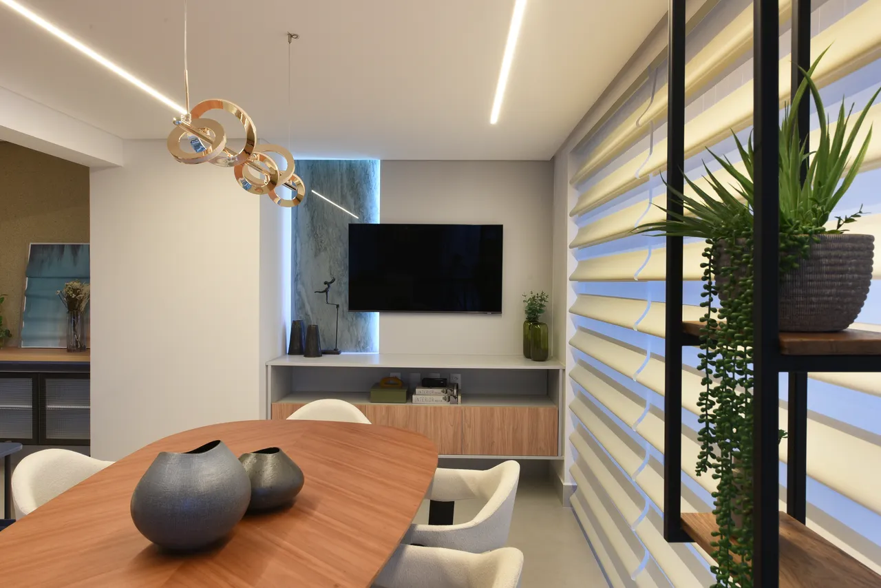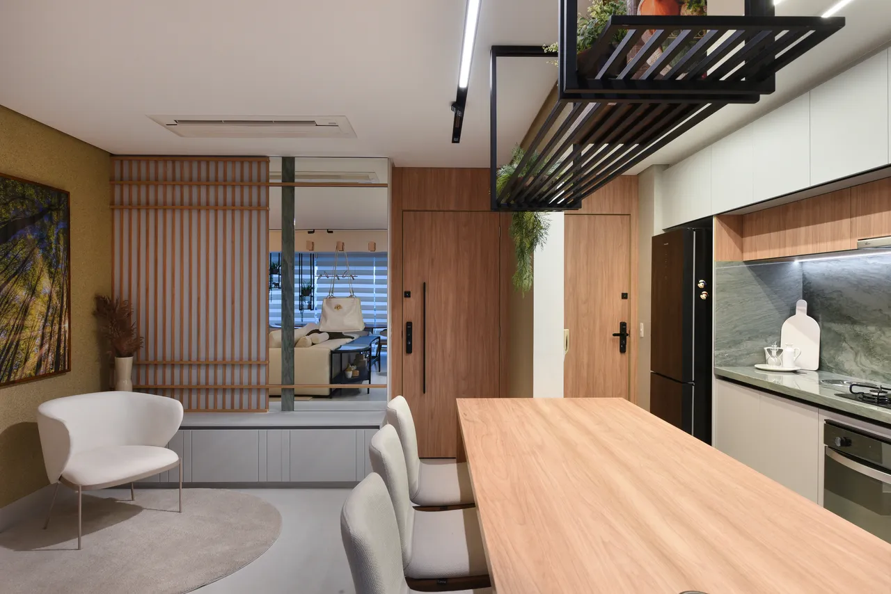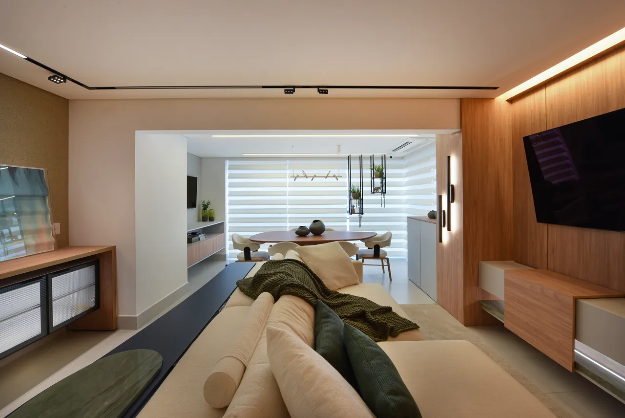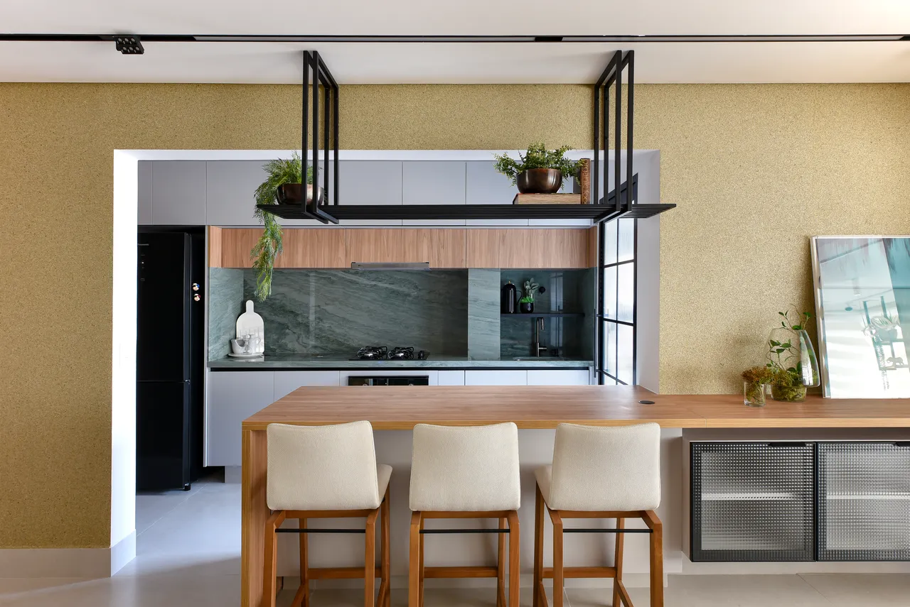 Trabalhamos com ambientes integrados, como a área social, projetada para ser espaçosa. Os móveis em tons de madeira foram cuidadosamente selecionados para criar um ambiente caloroso e agradável, enquanto a combinação com o quartzito verde eleva ainda mais a sofisticação.