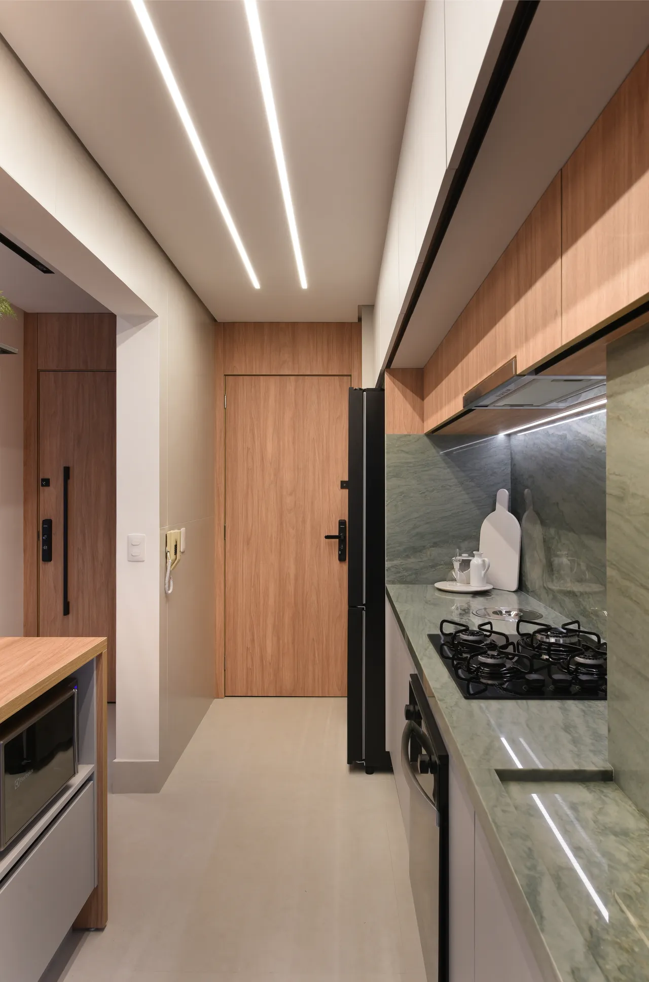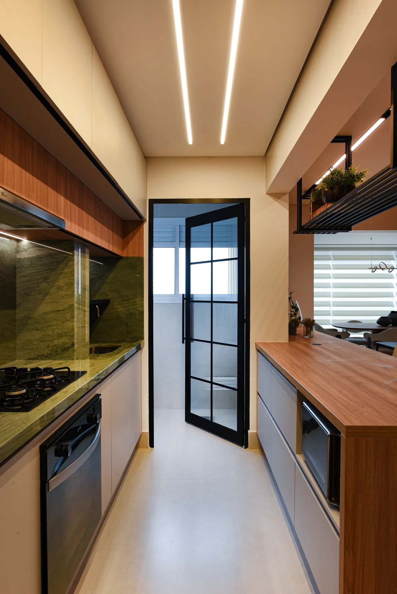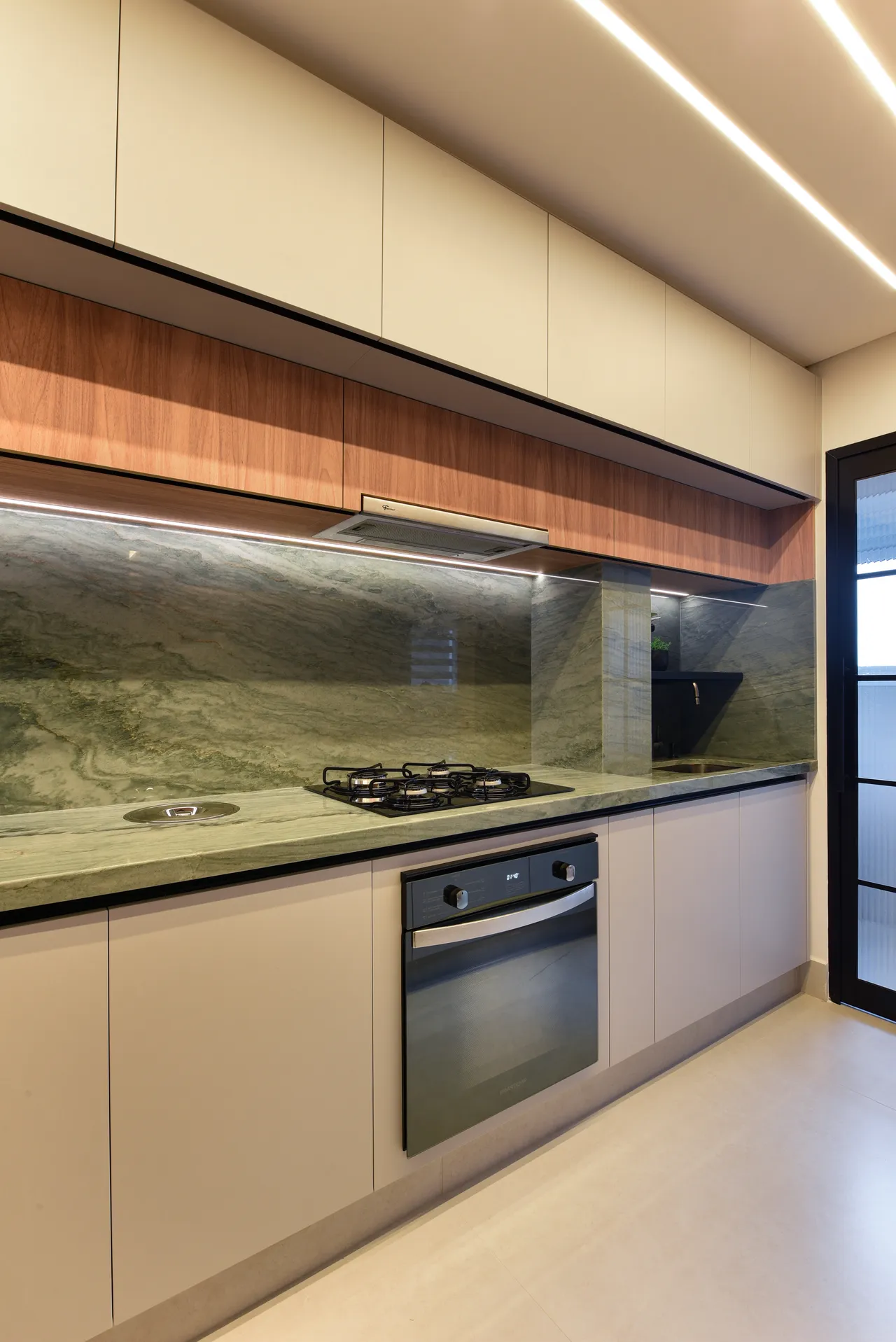Trabalhamos com ambientes integrados, como a área social, projetada para ser espaçosa. Os móveis em tons de madeira foram cuidadosamente selecionados para criar um ambiente caloroso e agradável, enquanto a combinação com o quartzito verde eleva ainda mais a sofisticação.
