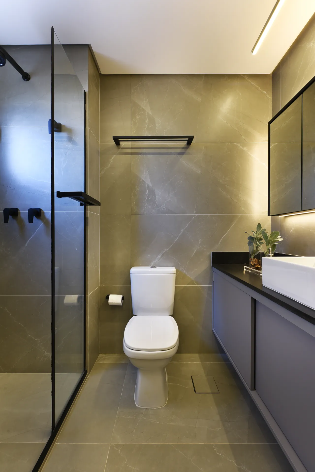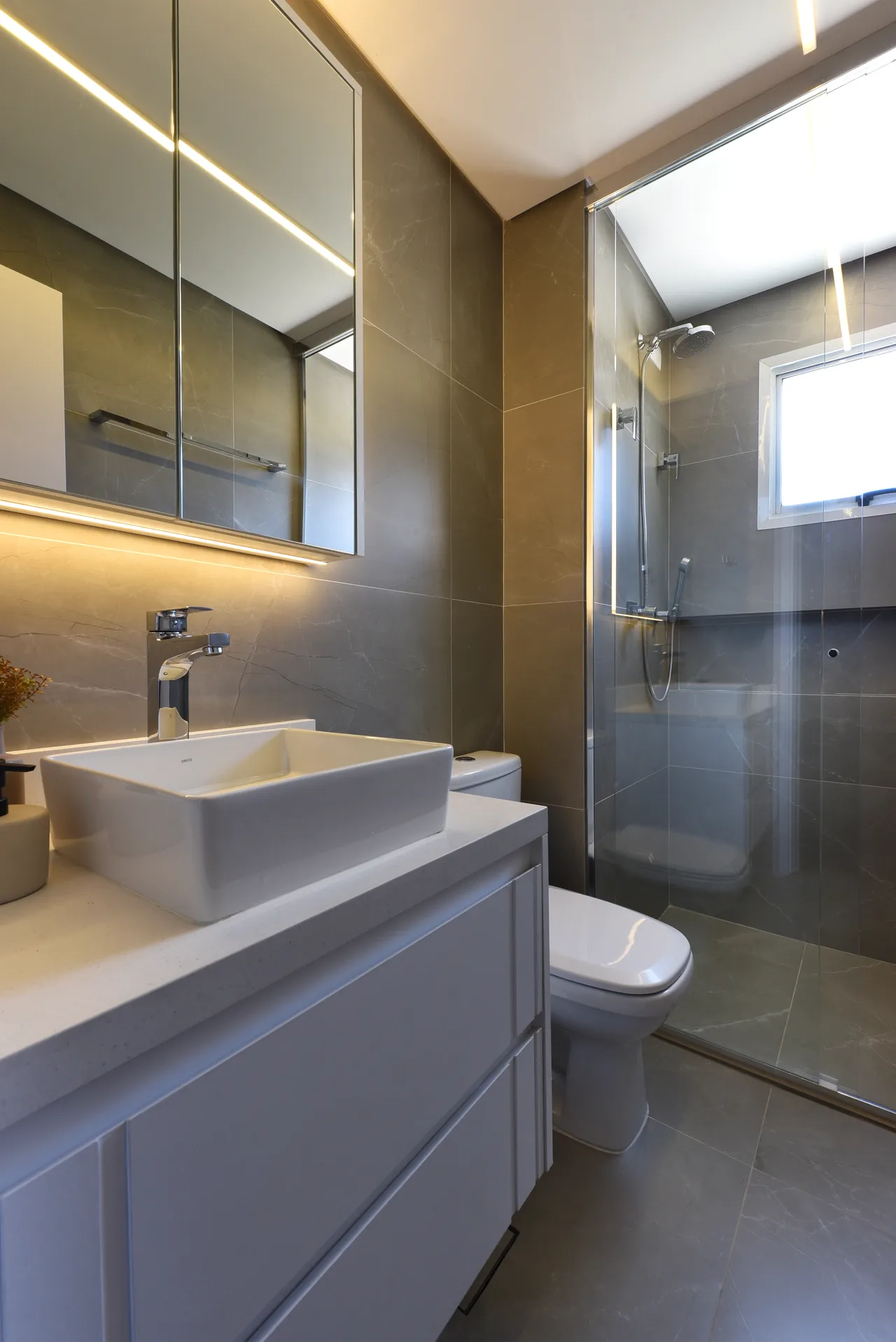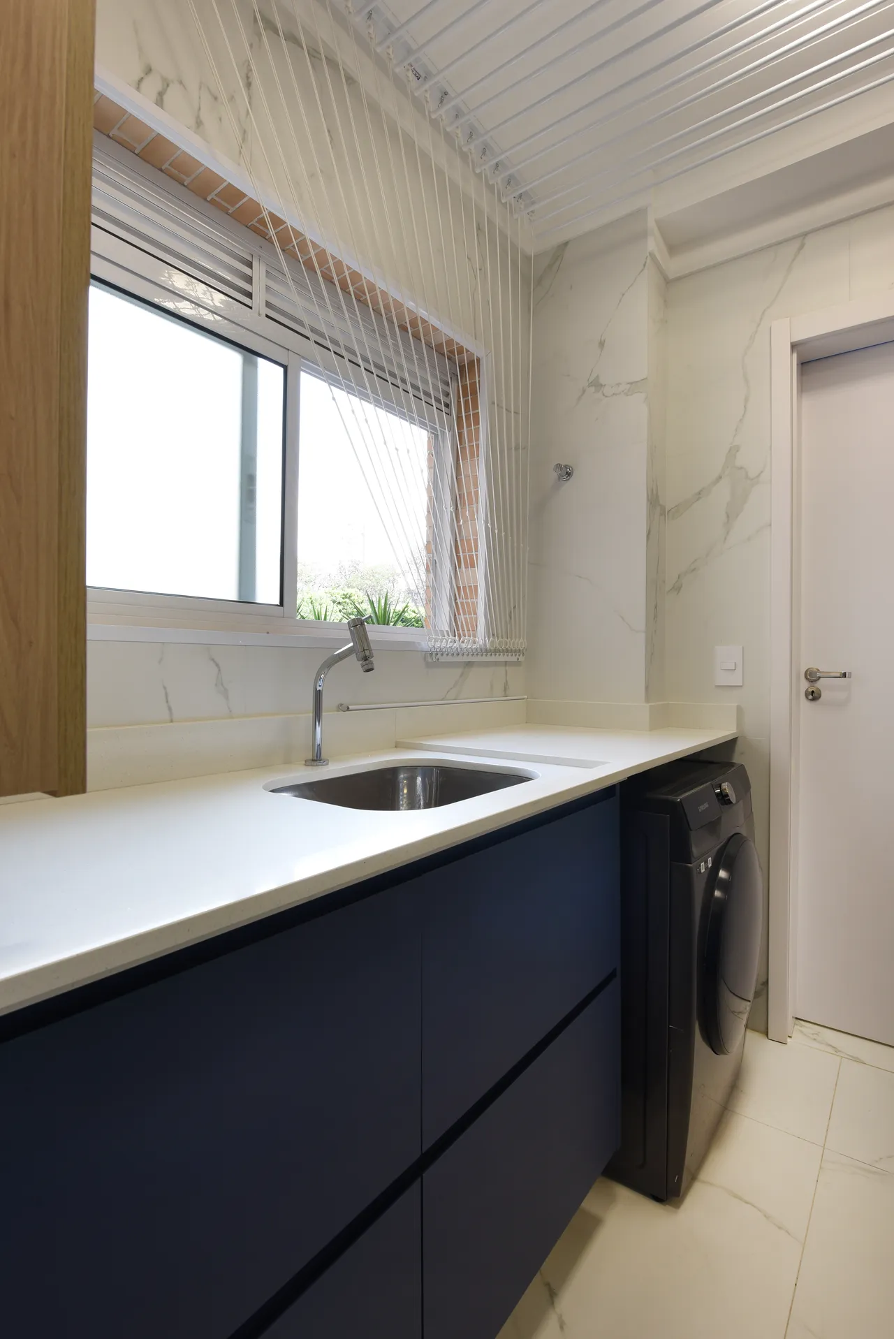 Neste apartamento, o layout integra a sala de estar e a sala de jantar, favorecendo a convivência e o compartilhamento de momentos em família. A cozinha e a lavanderia transmitem uma sensação de leveza e organização com o revestimento que remete ao mármore Calacata e as bancadas brancas.
