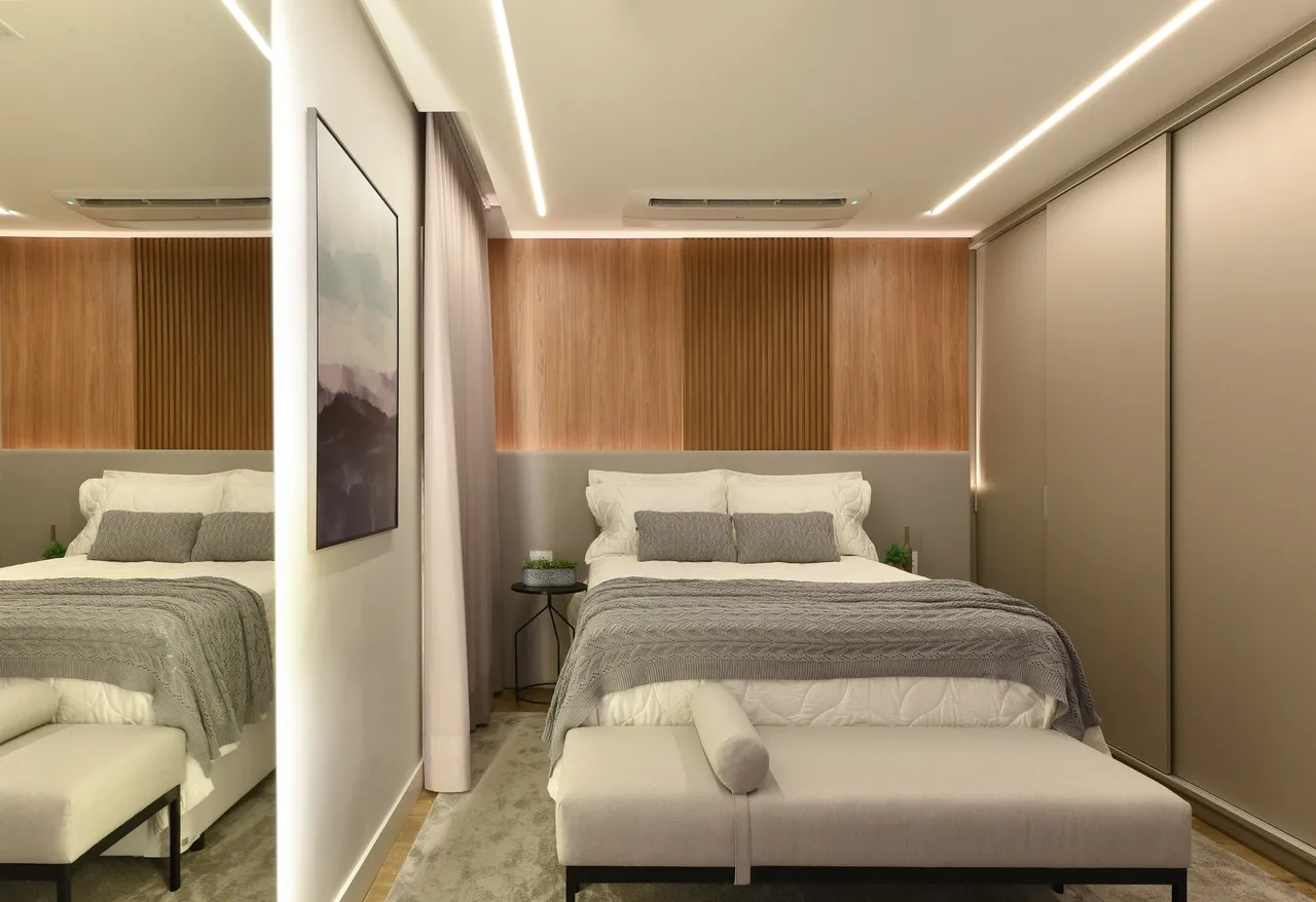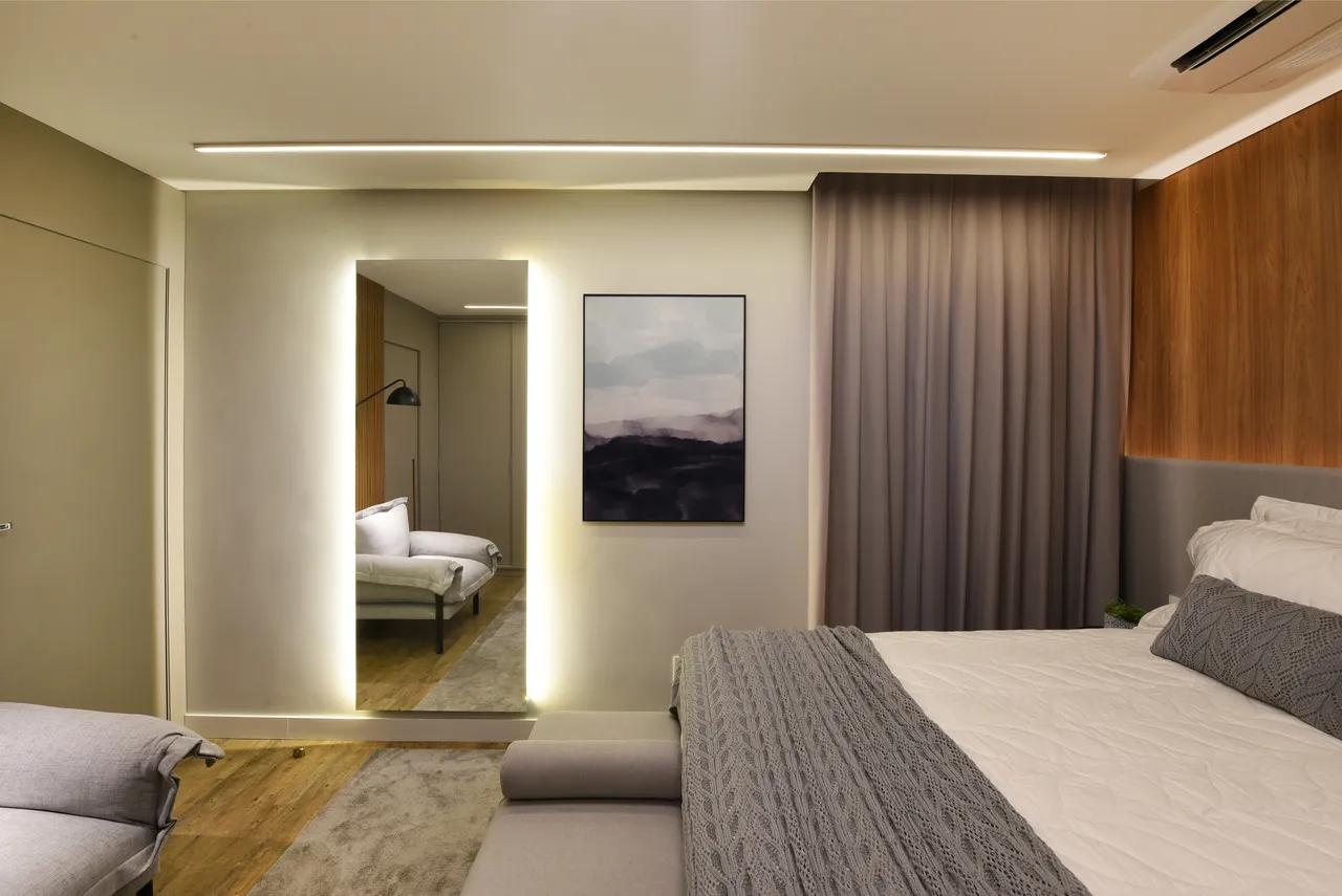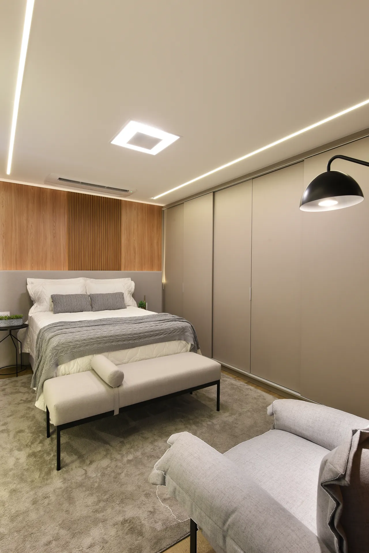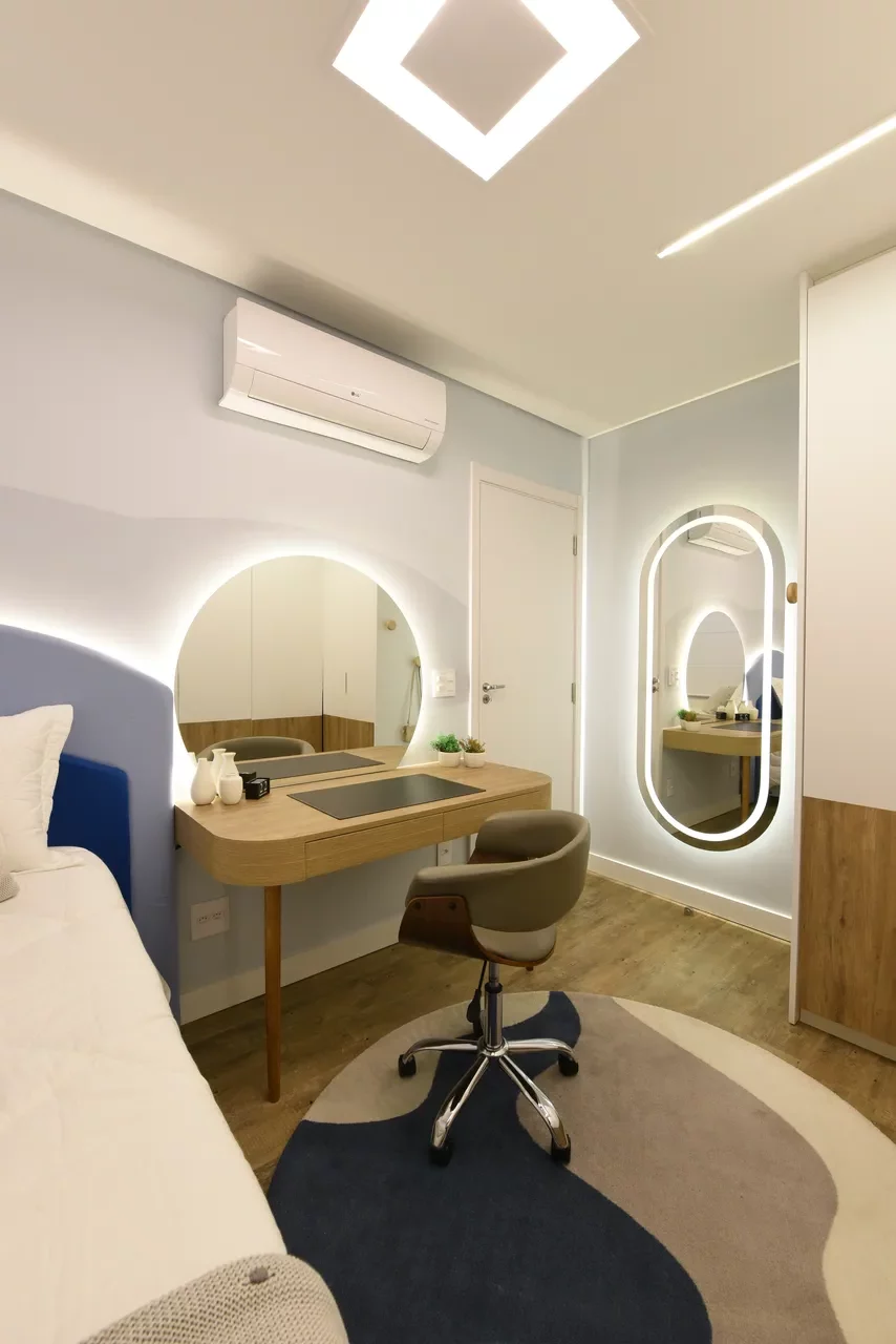 Na área íntima, são adicionados toques personalizados nas suítes, como o quarto com tons de azul, lembrando o desenho das nuvens. Na suíte do casal, encontramos tons de cinza e amadeirado, trazendo equilíbrio e elegância.