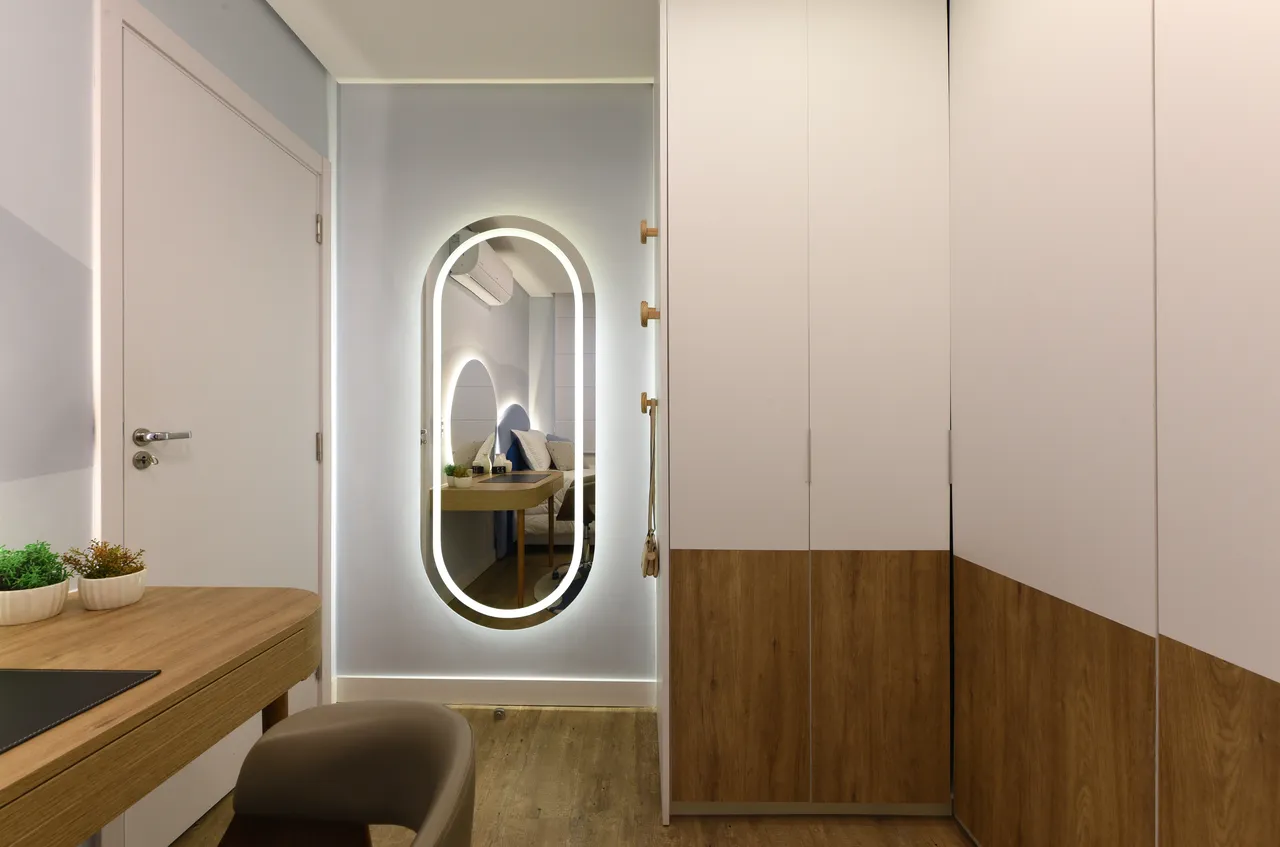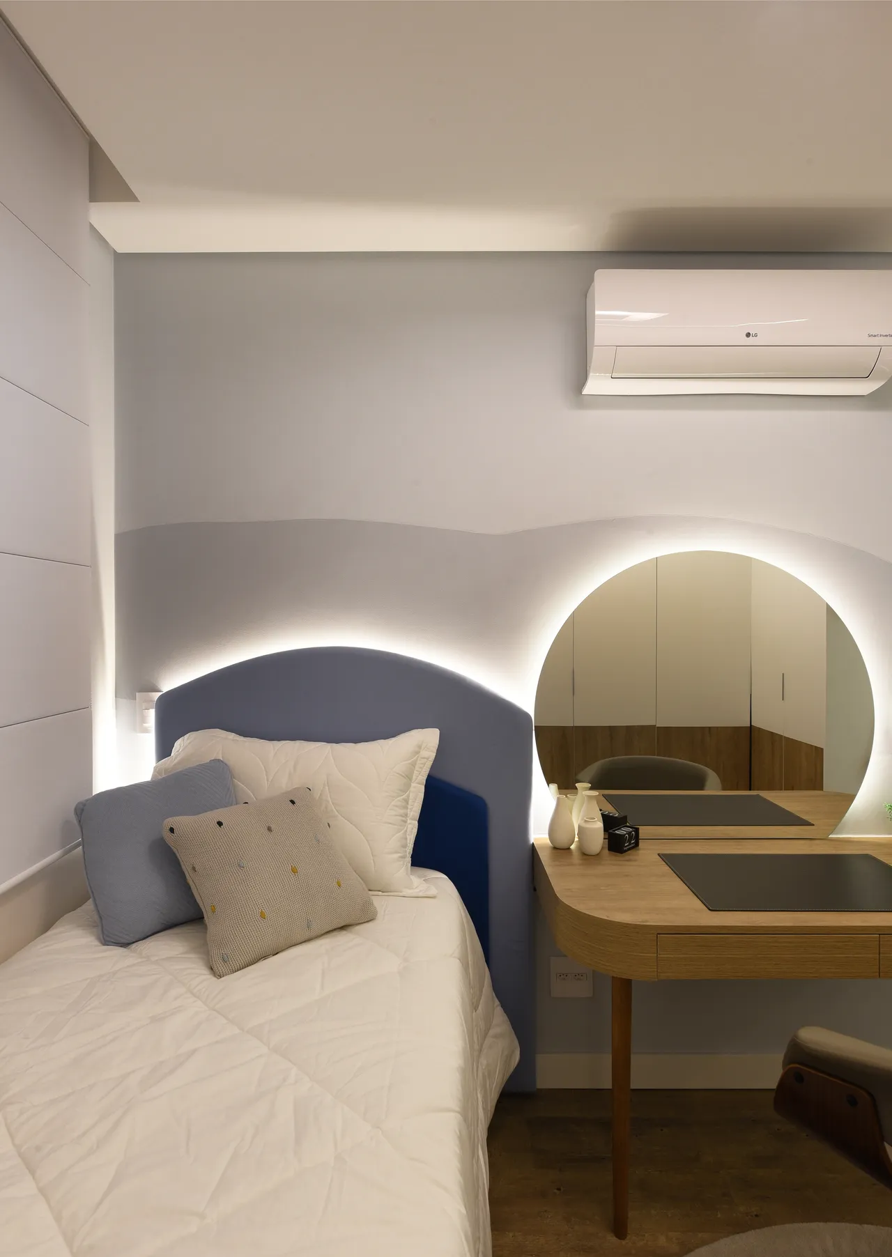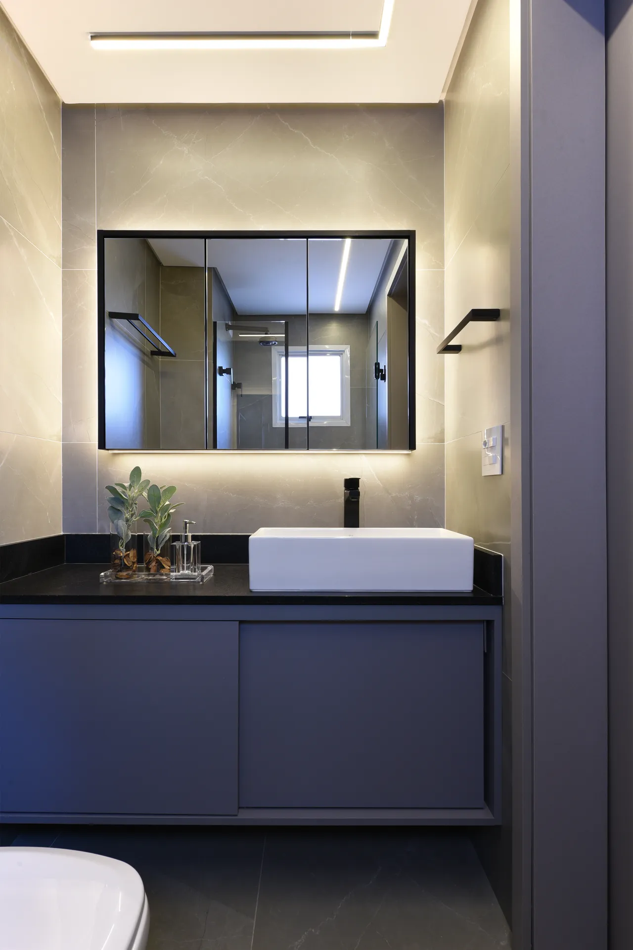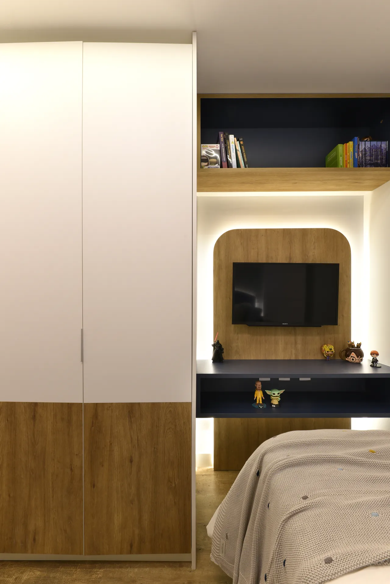 Na área íntima, são adicionados toques personalizados nas suítes, como o quarto com tons de azul, lembrando o desenho das nuvens. Na suíte do casal, encontramos tons de cinza e amadeirado, trazendo equilíbrio e elegância.