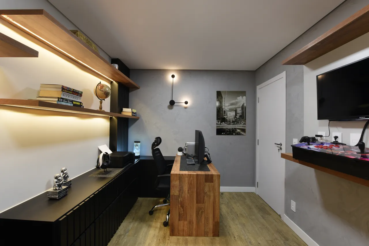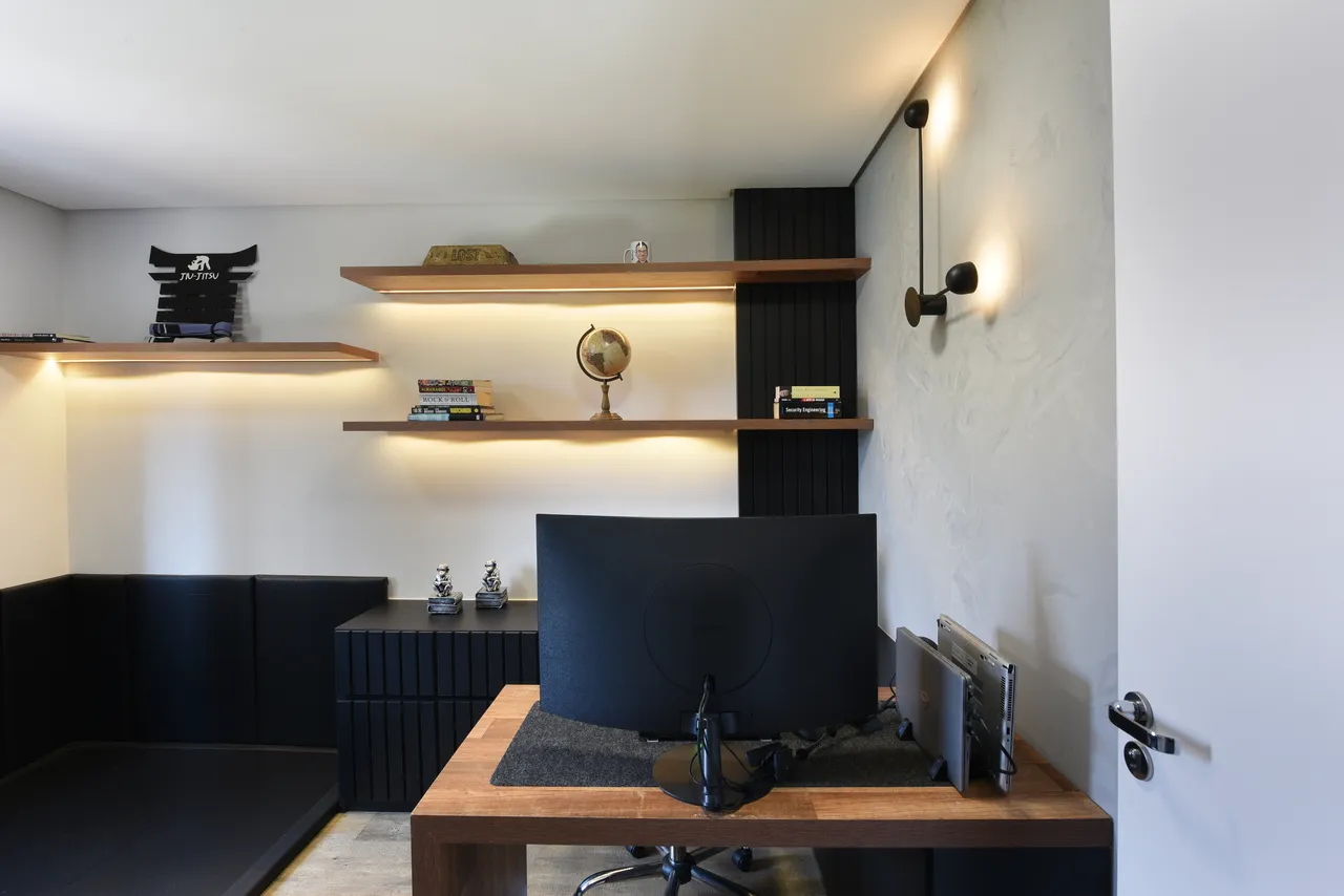O escritório descontraído conta com a instalação de tatame para a prática de lutas marciais. A marcenaria em tons escuros compõe a área do escritório, promovendo seriedade e concentração ao espaço. Para os momentos de lazer, a TV com videogames adiciona o toque final.