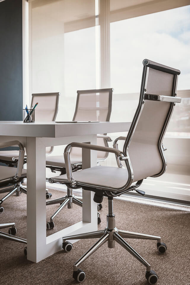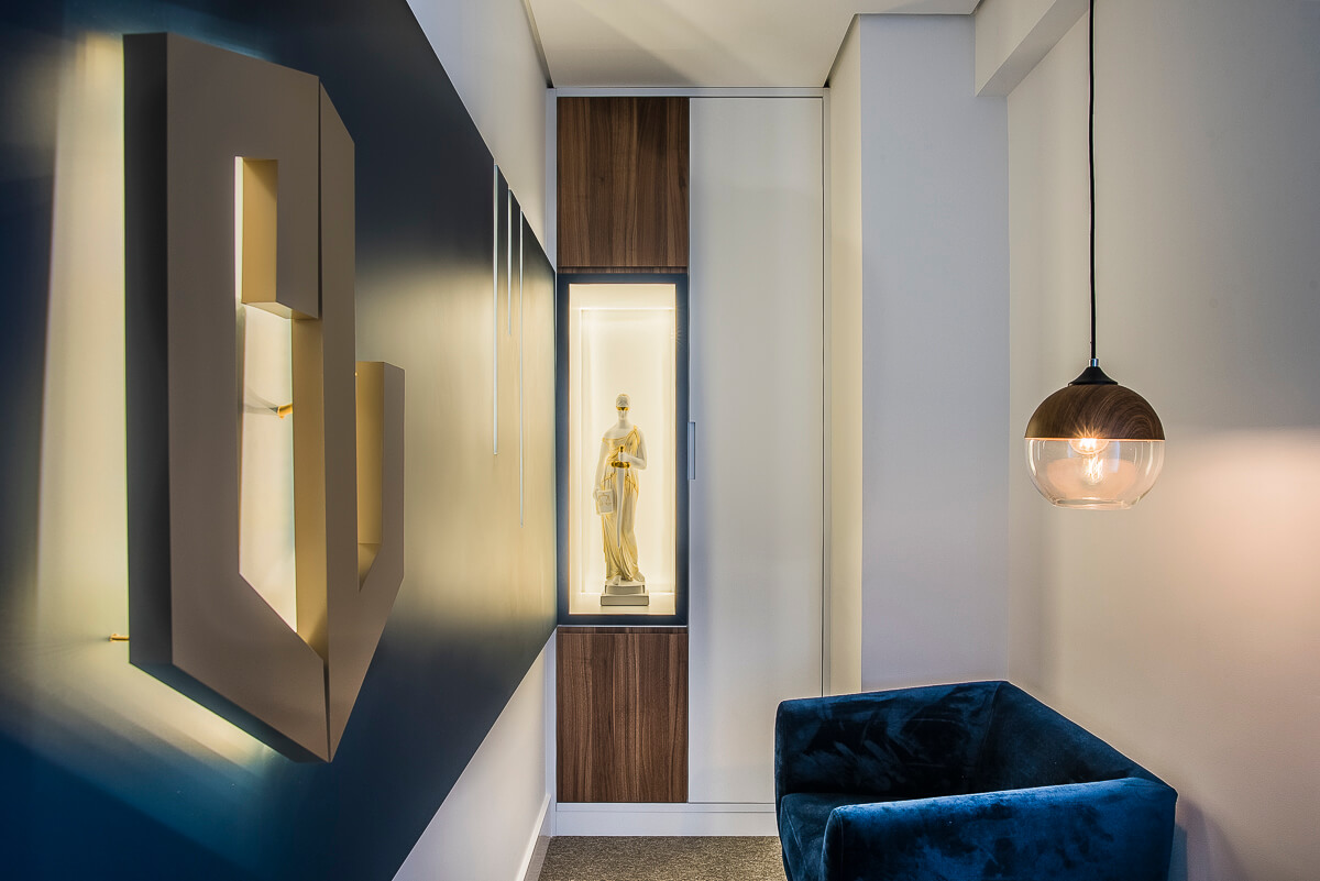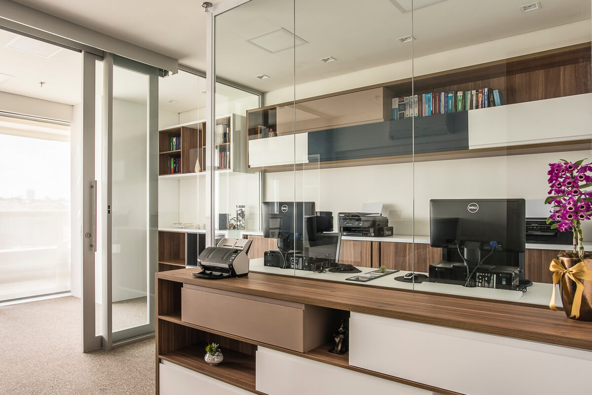 O escritório é sofisticado, moderno e imponente. Projetamos uma marcenaria exclusiva desenvolvida para otimizar os espaços, a recepção contém um painel com o logo e atrás um luminoso fazendo com que o nome Carabaca & Laguna fique em evidência, este painel integra-se à marcenaria lateral criando um hall que se atribui importância.