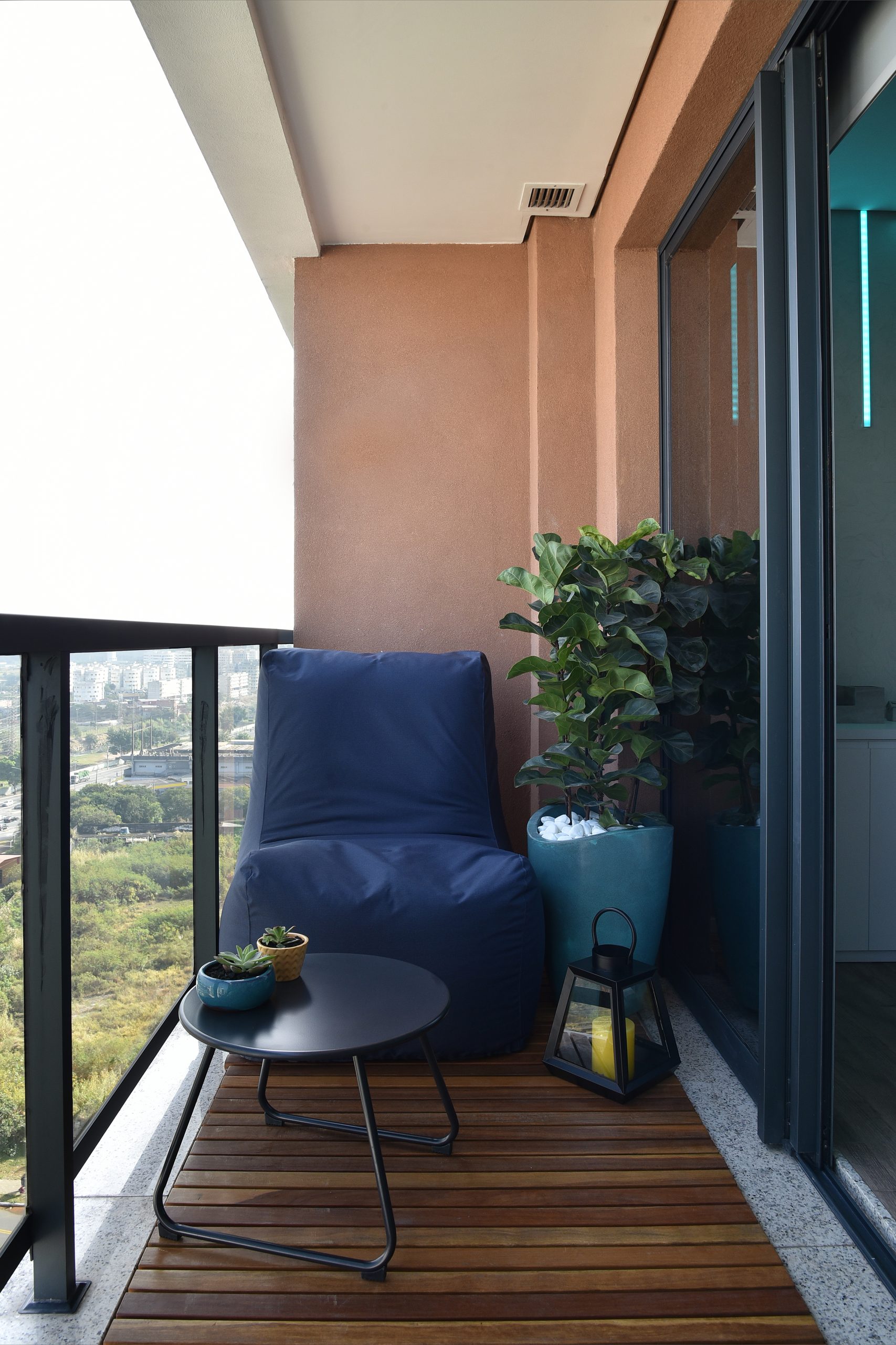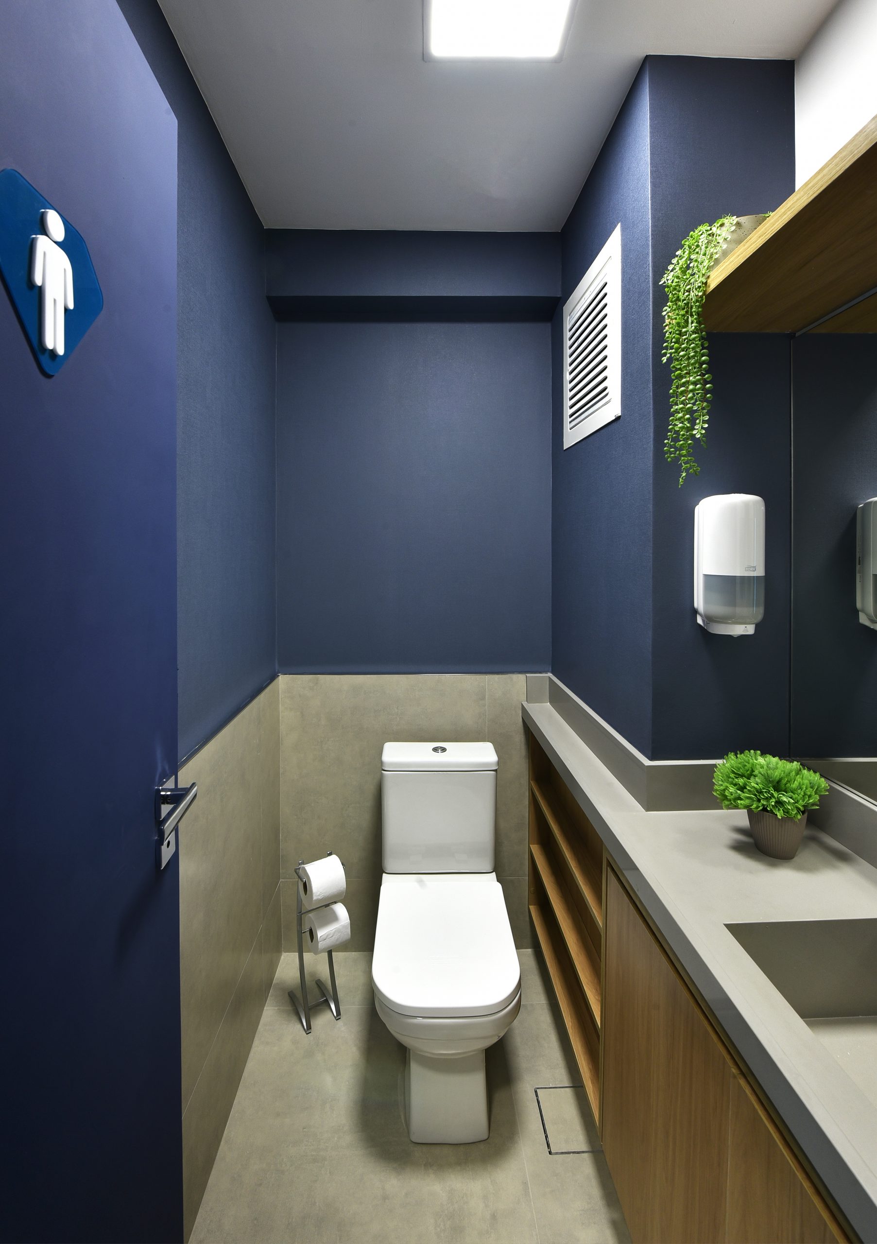 As cores foram amplamente usadas nos espaços, como agentes transformadoras de sensações. No espaço da copa e convivência, criamos um bloco azul que tem função de setorização e passa sensação de confiança, segurança e relaxamento.