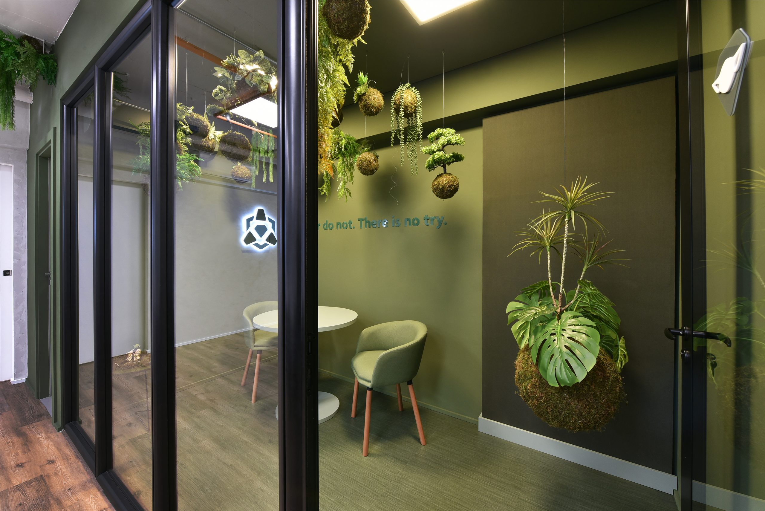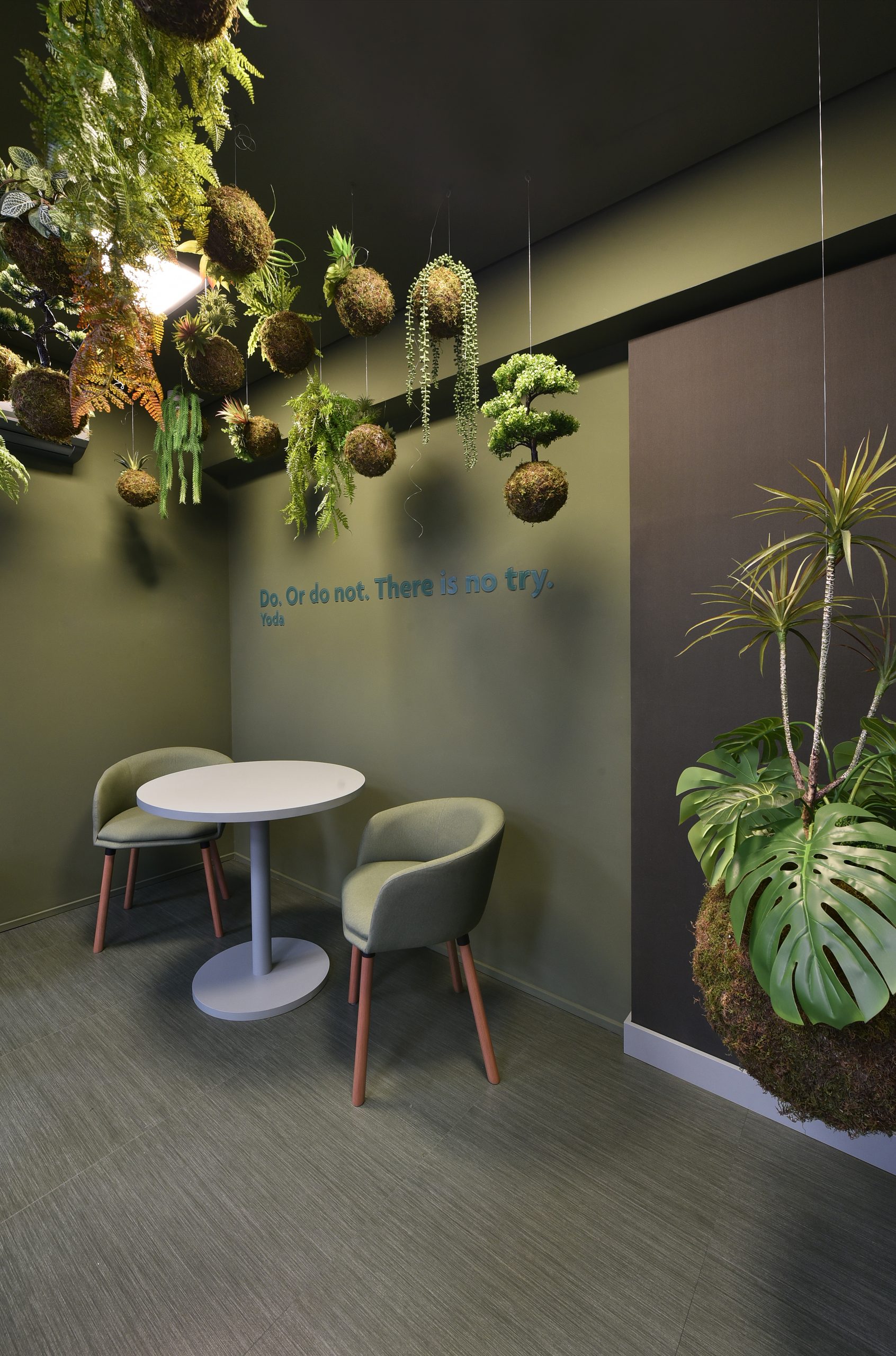 Na sala verde, a representação da natureza é aplicada através da cor verde e diversas plantas (kokedamas) instaladas em todo ambiente, toda essa composição foi criada para transmitir sensações de equilíbrio, harmonia e frescor ao ambiente.