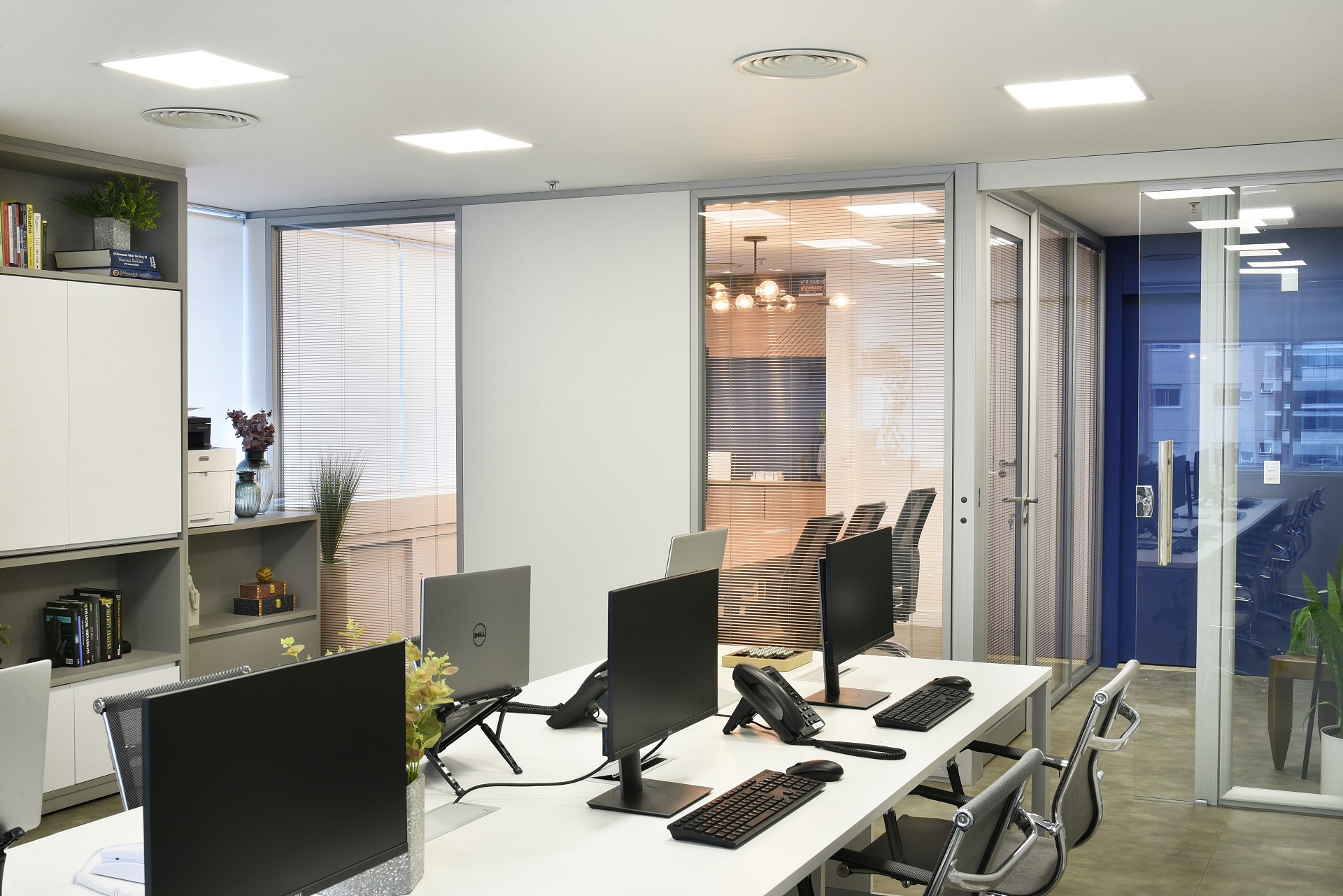 Para as divisões dos ambientes, foram projetadas divisórias em vidro, permitindo criar espaços com maior visibilidade e, em contrapartida, persianas presentes no próprio caixilho, trazendo maior privacidade para os momentos necessários.